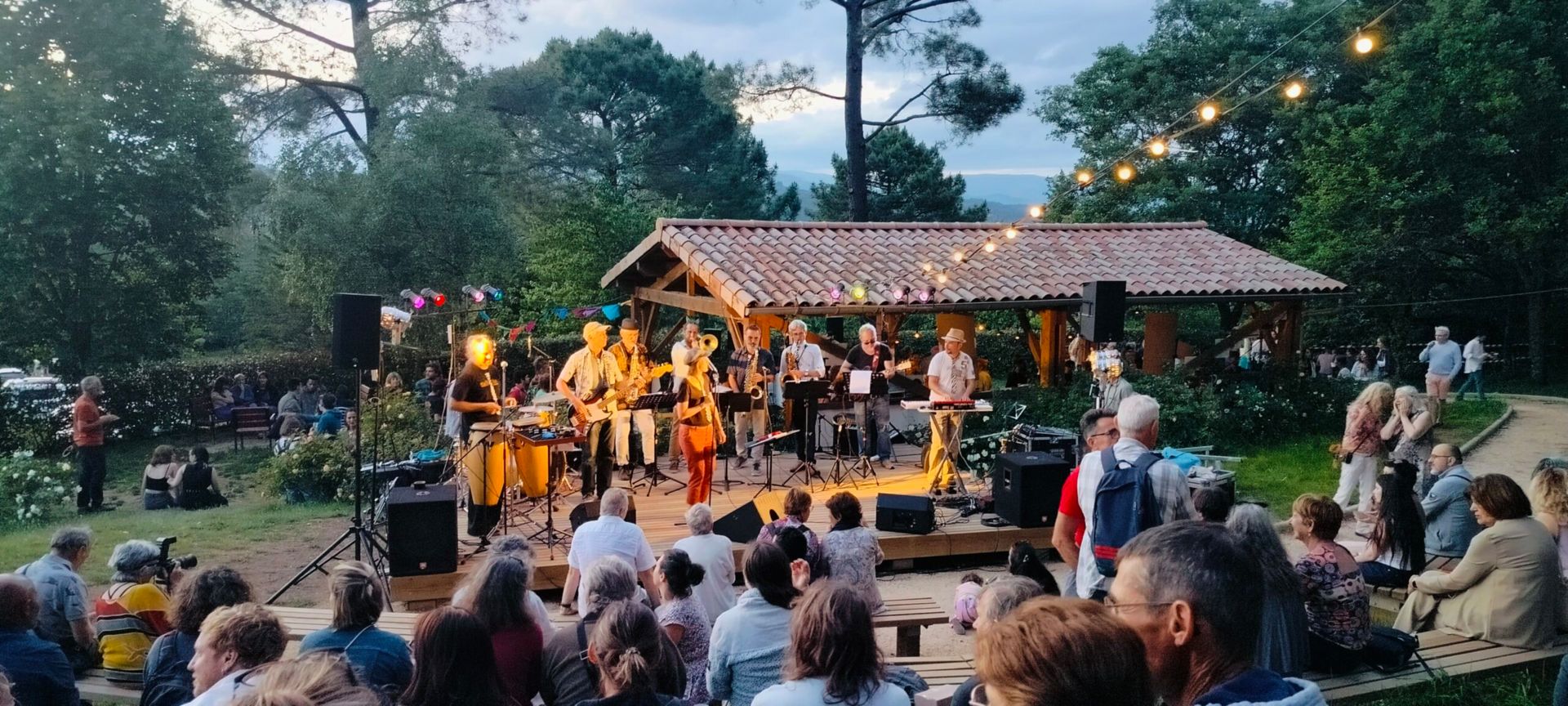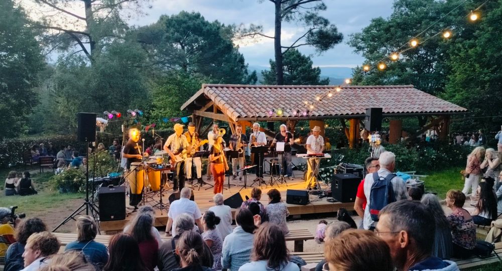 On termine la soirée en beauté avec la fanfare funk ardéchoise Grüve : une déambulation acoustique sous les pins, du groove à chaque pas et une énergie contagieuse qui vient mettre tout le monde d’accord pour le final.