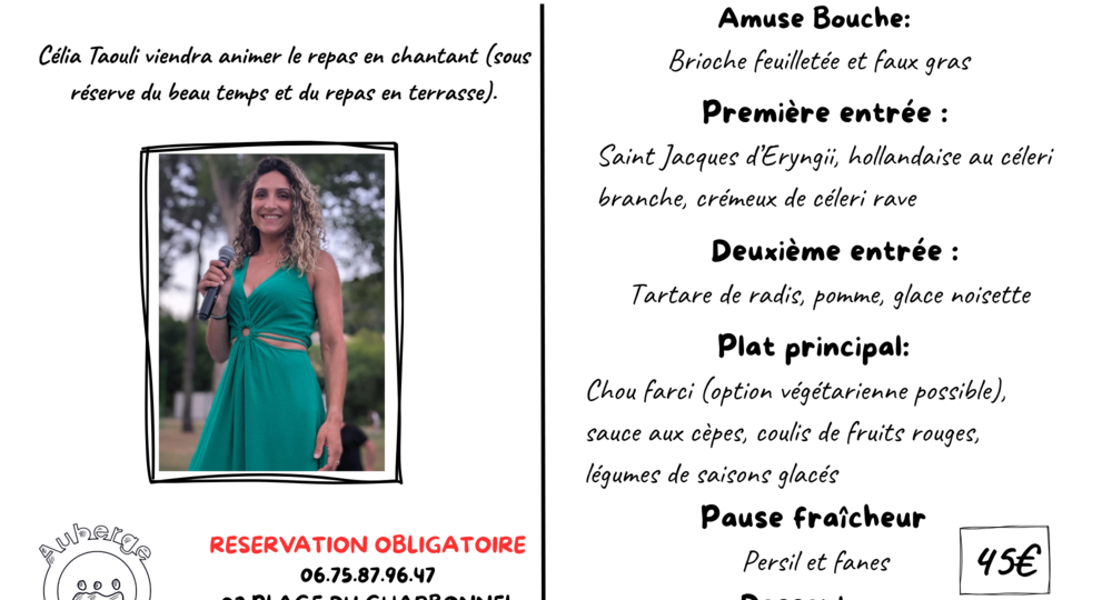 À l’occasion de la fête des Mères, l’Auberge des Trois Ami.e.s vous propose un menu spécial avec une chanteuse pour animer le déjeuner !