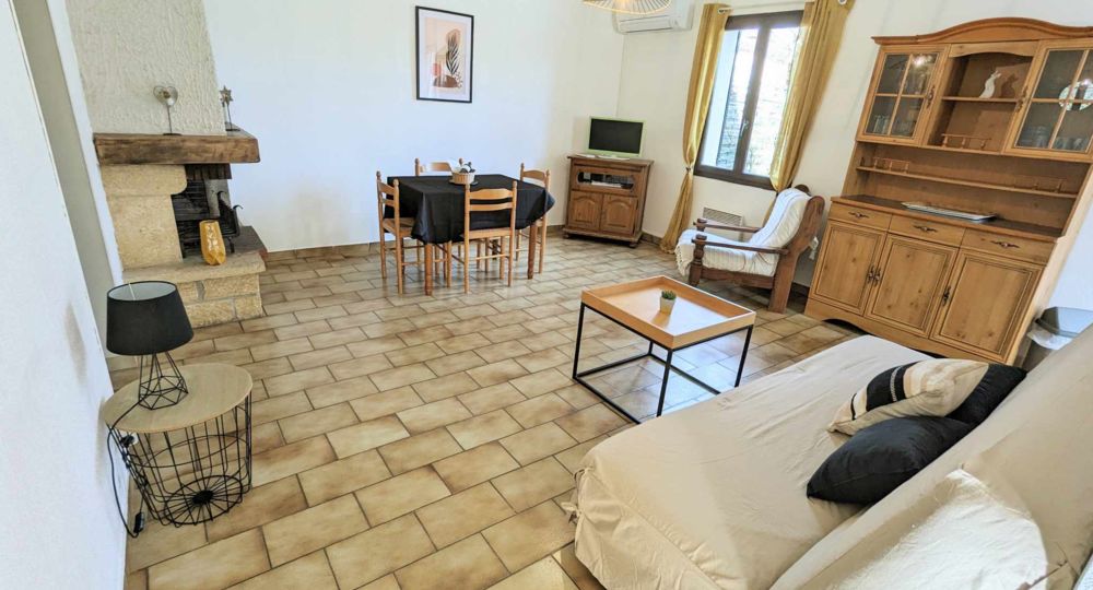 Un salon/salle à manger avec coin repas, canapé , télévision écran plat, un coin cuisine tout équipé (4 feux gaz, un four traditionnel, un four micro-ondes, un réfrigérateur-congélateur, lave-vaisselle, cafetière électrique, bouilloire, grille-pain, vaisselle et ustensiles de cuisine…). Fer et table à repasser, aspirateur.