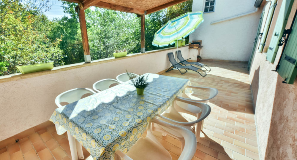 Une grande terrasse avec salon de jardin, parasol et barbecue.