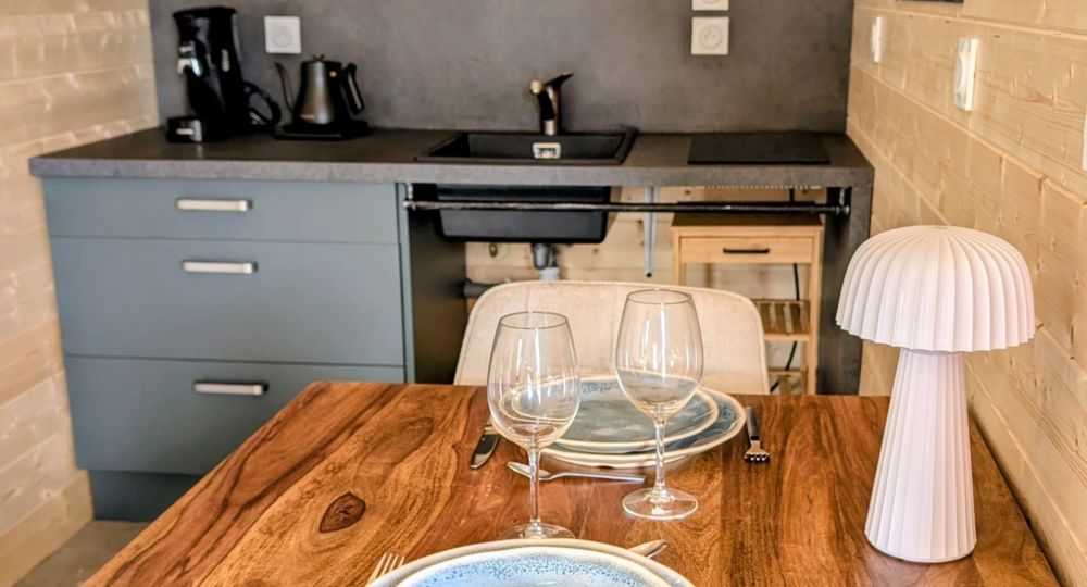 Le studio Bali, conçu pour deux personnes, dispose d’une cuisine équipée (cafetière Senseo, bouilloire, grille-pain, plaque à induction, frigo-freezer), d’un lit queen size 160×200, d’une baignoire balnéo 2 personnes avec bluetooth et luminothérapie, de la climatisation, d’une connexion Wi-Fi et d’un salon de jardin ouvert sur la nature.