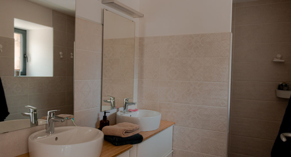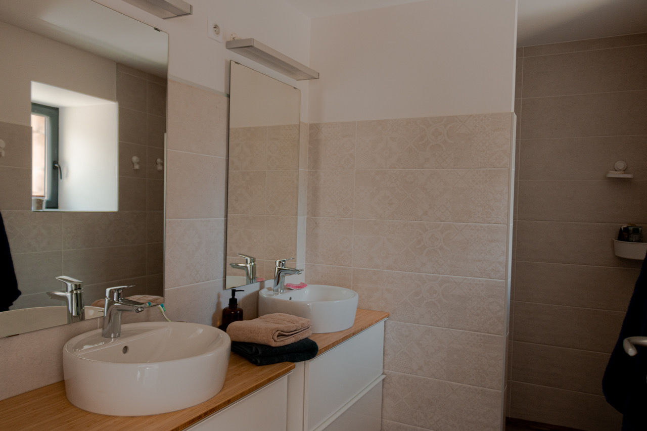 Rez-de-chaussée : – cuisine toute équipée (lave-vaisselle, plaque à induction, four, grille-pain, réfrigérateur, congélateur, micro-ondes, machine à café …) – un salon avec un canapé convertible, une télévision et la WiFi, une chambre avec un lit 160×200 – une salle de bain avec double vasque et douche à l’italienne, ainsi qu’un wc séparé – une buanderie avec lave-linge, un aspirateur ,fer à repasser sont aussi à votre disposition – à l’étage il y a une chambre avec 2 lits 160×200 , une chambre avec un lit 160×200, une salle de bain , wc.