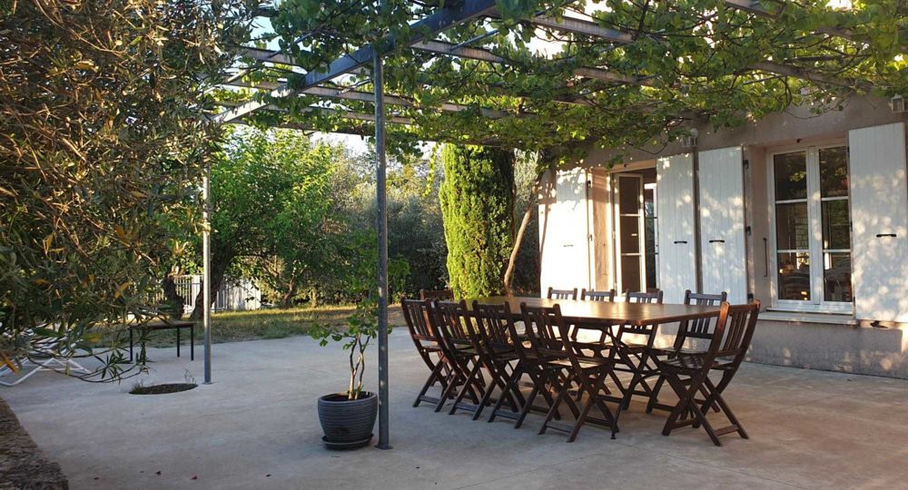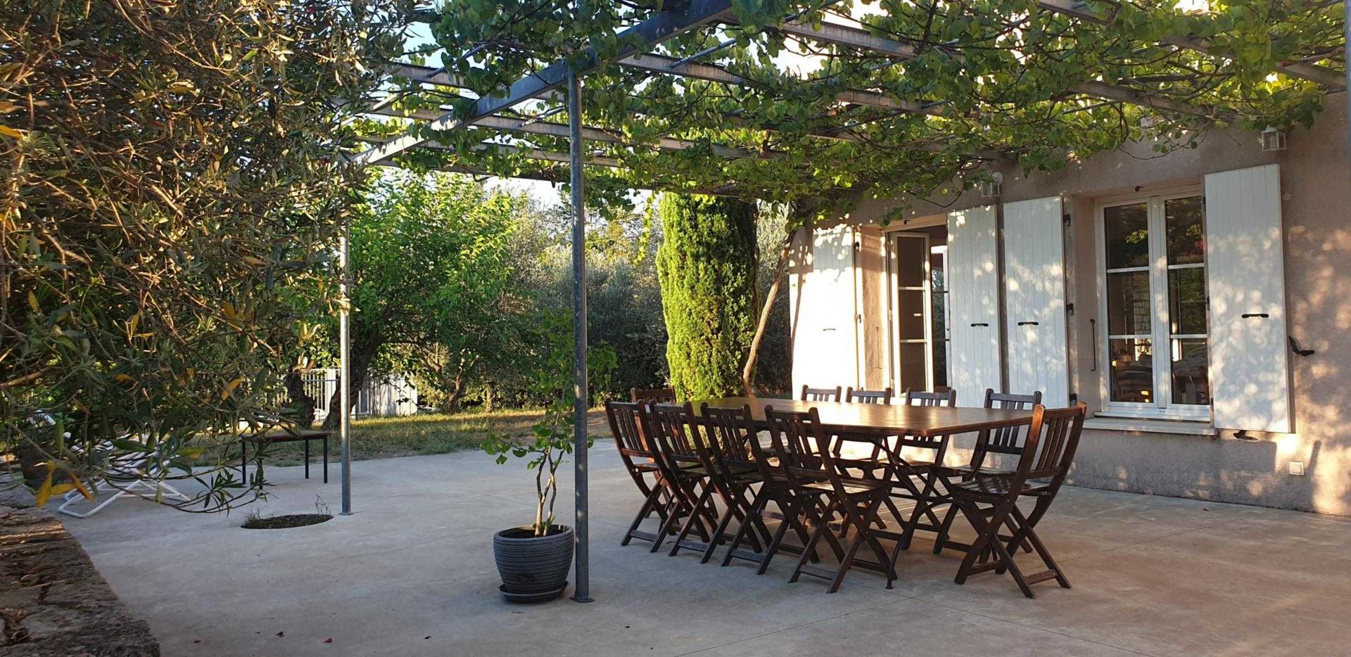 Très belle maison indépendante, idéale pour réunions de familles ou rencontres entre amis, en Ardèche méridionale. Terrasse ombragée par la tonnelle pour le soleil du matin, une autre plus spacieuse couverte pour l’ensoleillement max., piscine chauffée.