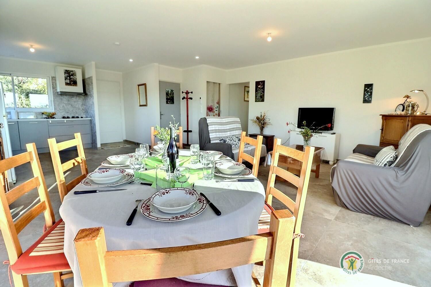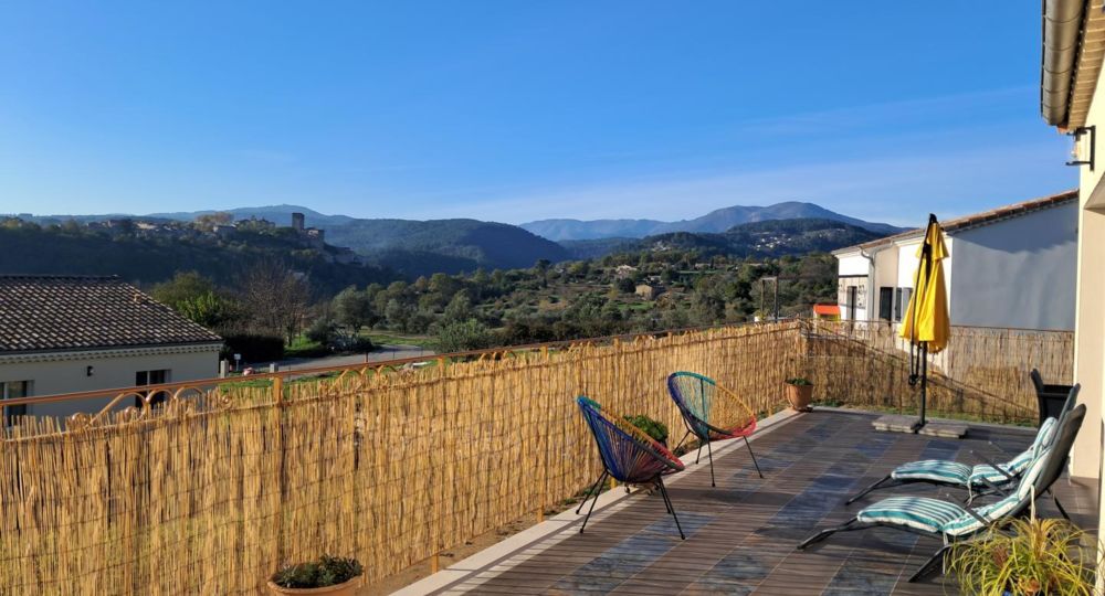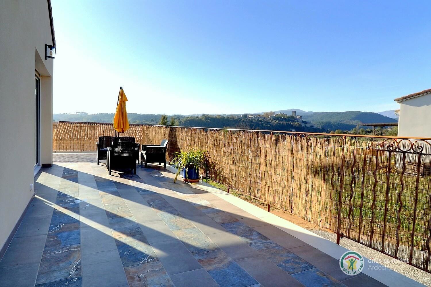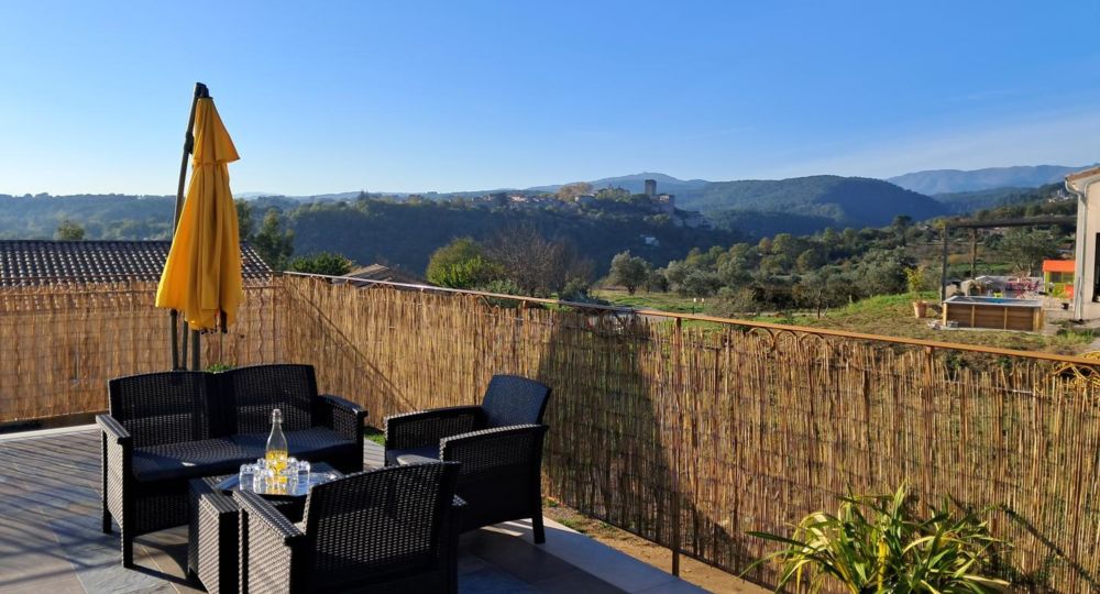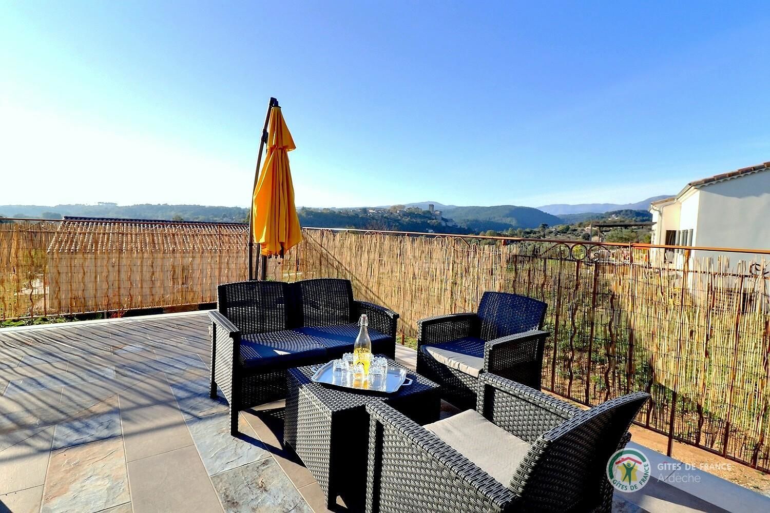 Appréciez la situation privilégiée du gîte La Madeleine avec sa vue panoramique sur le Château de Montréal, le Tanargue et un environnement au calme !