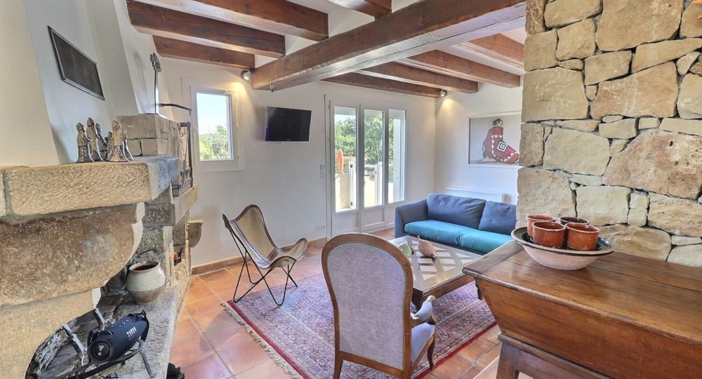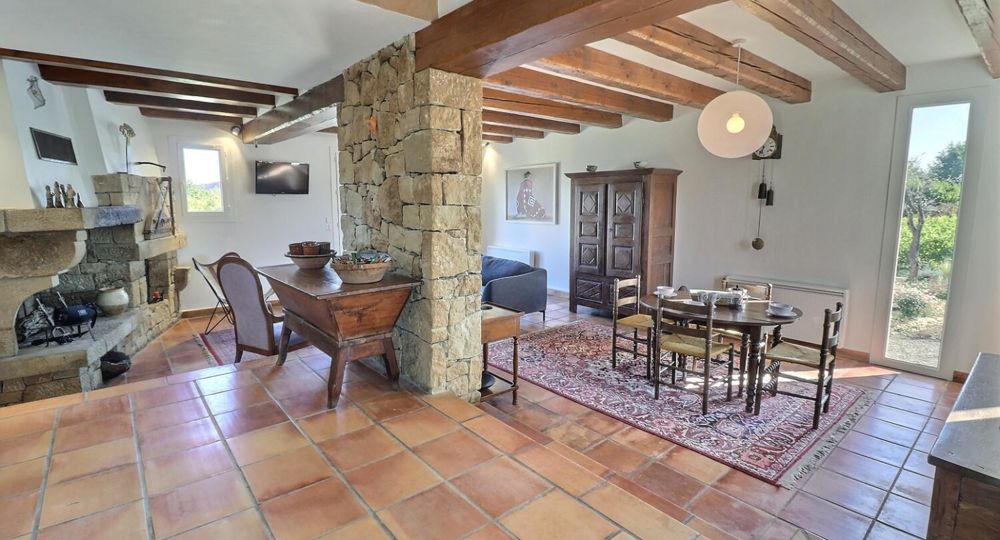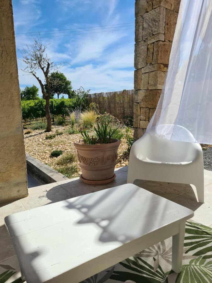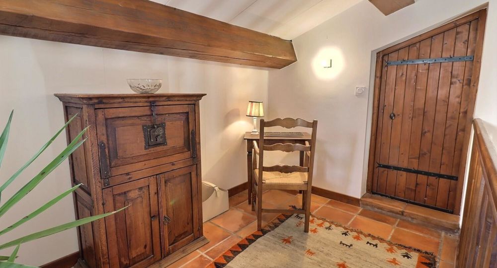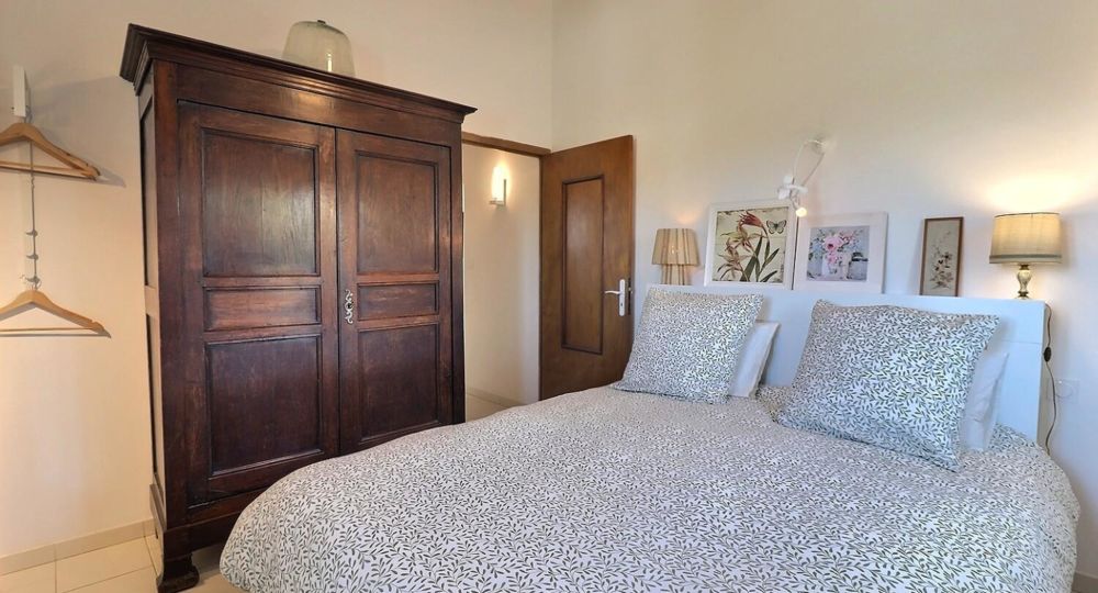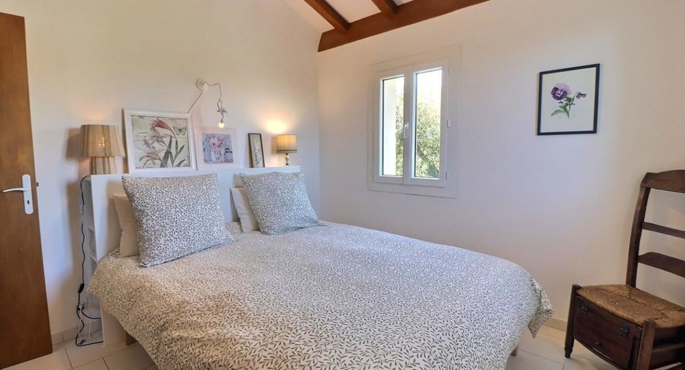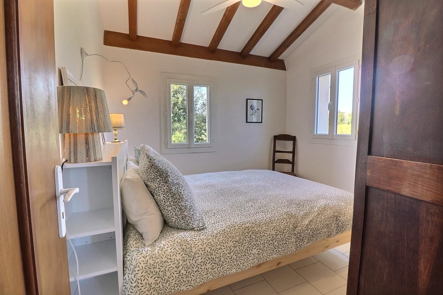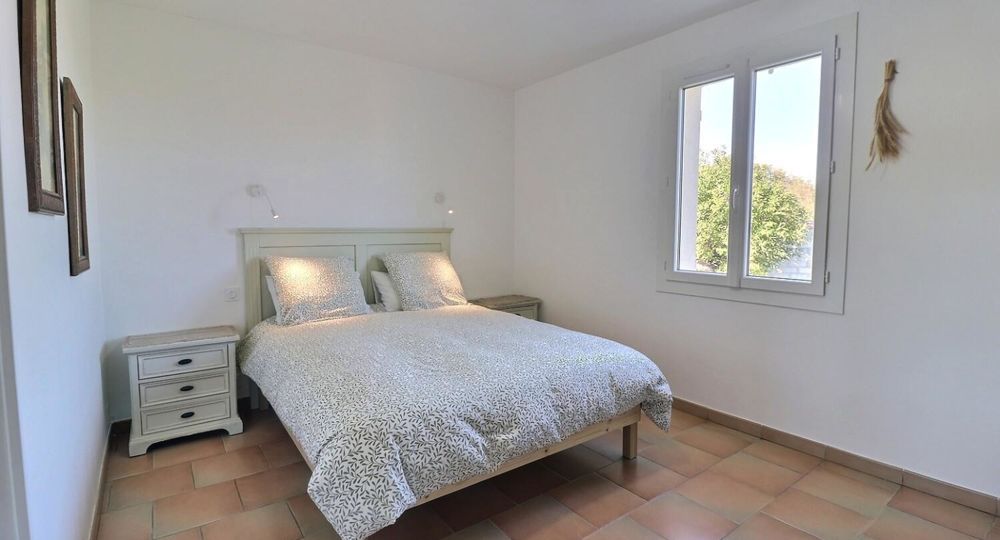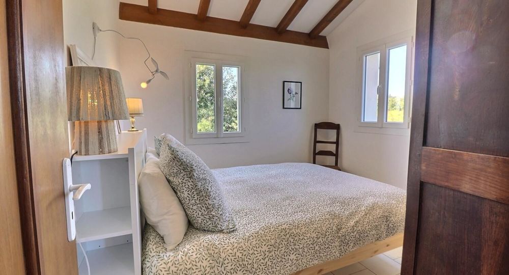De grandes fenêtres offrent une belle vue sur le jardin ou l’extérieur. L’atmosphère générale est calme et accueillante. D’un côté, l’espace salon avec des canapés confortables, (cheminée en déco), de l’autre, un coin repas. La cuisine entièrement équipée est fonctionnelle. Pour conserver le charme local de l’Ardèche-Méridionale, quelques éléments de mobilier ancien rappellent l’histoire de la région et apportent une touche de caractère à cet espace moderne. Un 2e salon pour écouter de la musique ou lire au calme, avec accès sur la petite terrasse couverte. Une grande chambre (lit en 160) décorée avec des tons apaisants et un mobilier élégant. Salle d’eau (douche à l’italienne), wc indépendant.