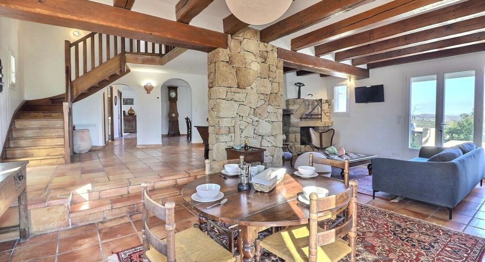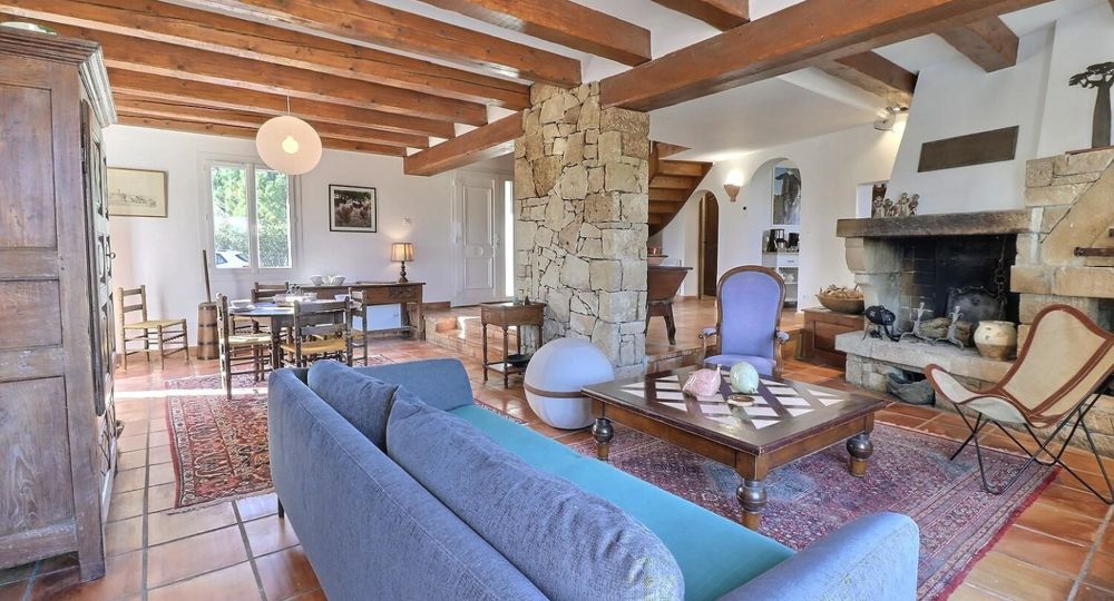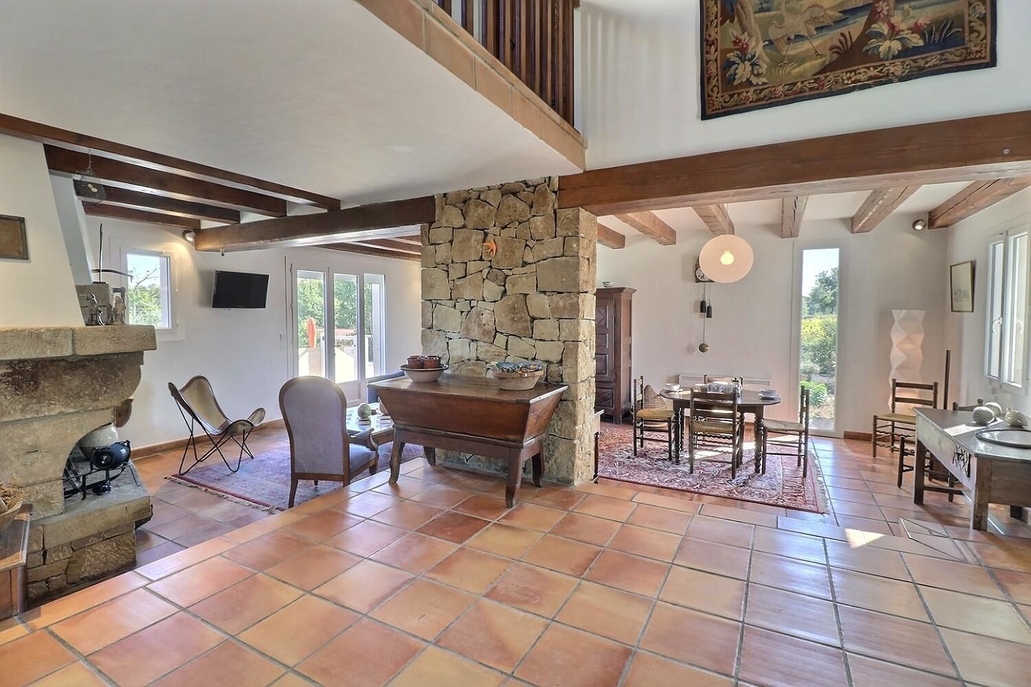 De grandes fenêtres offrent une belle vue sur le jardin ou l’extérieur. L’atmosphère générale est calme et accueillante. D’un côté, l’espace salon avec des canapés confortables, (cheminée en(…)