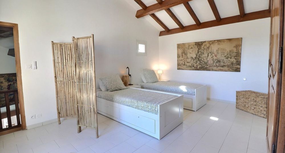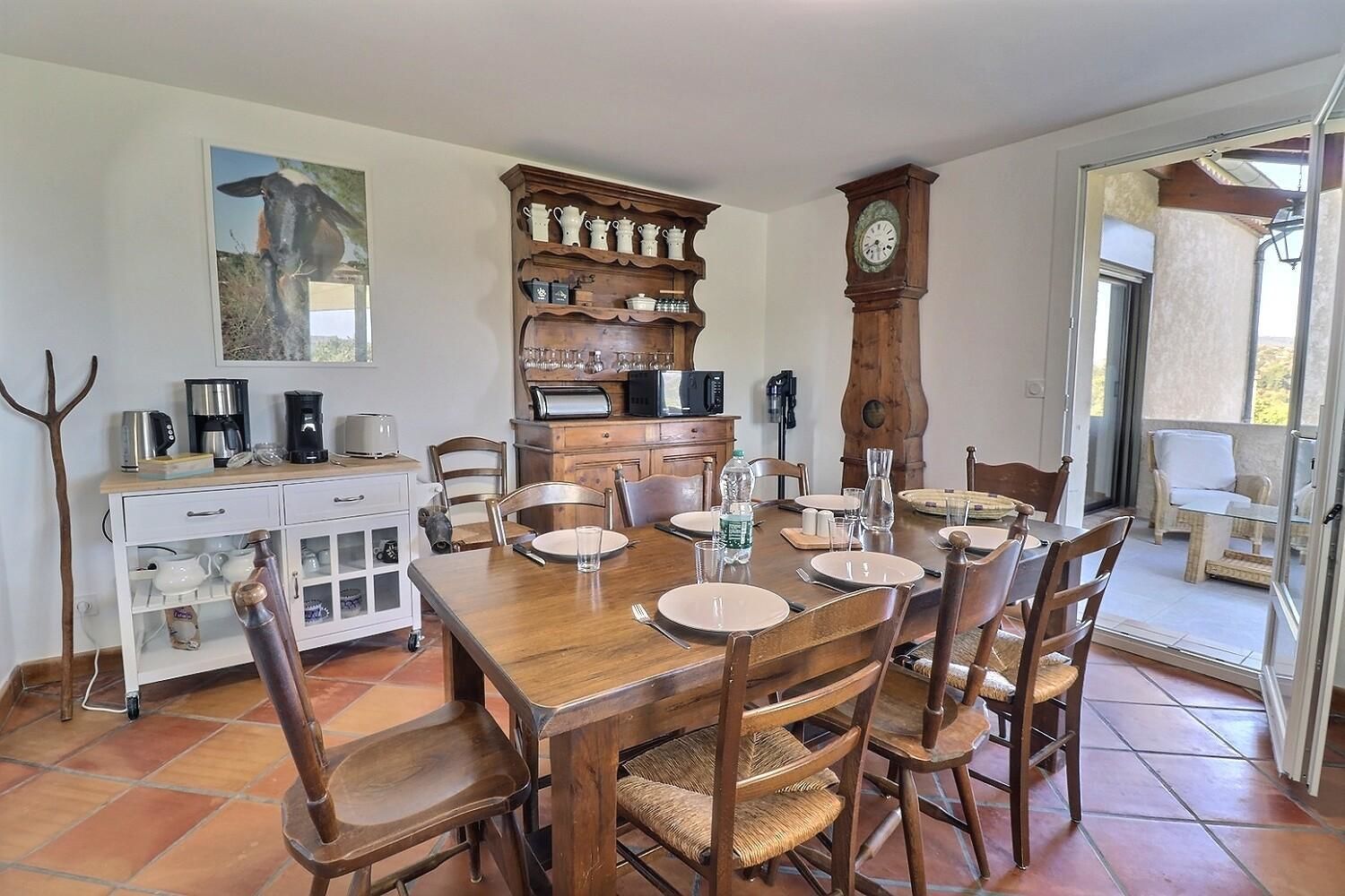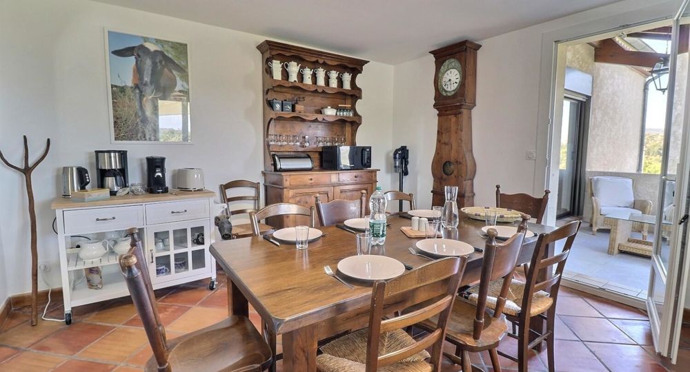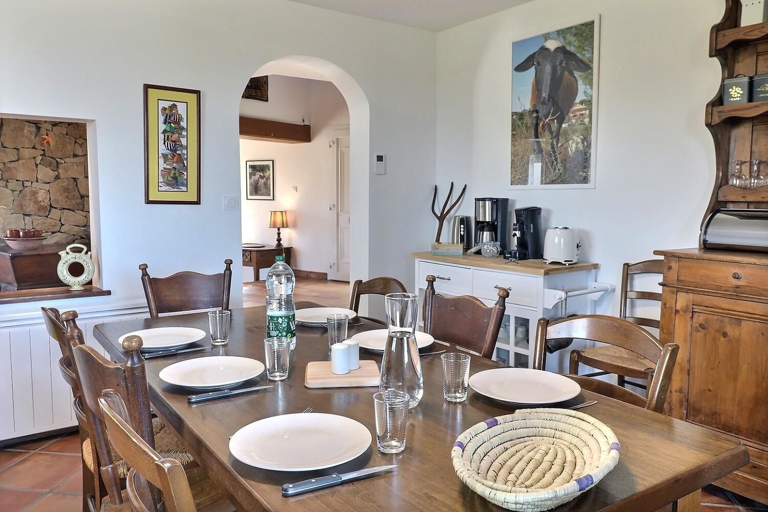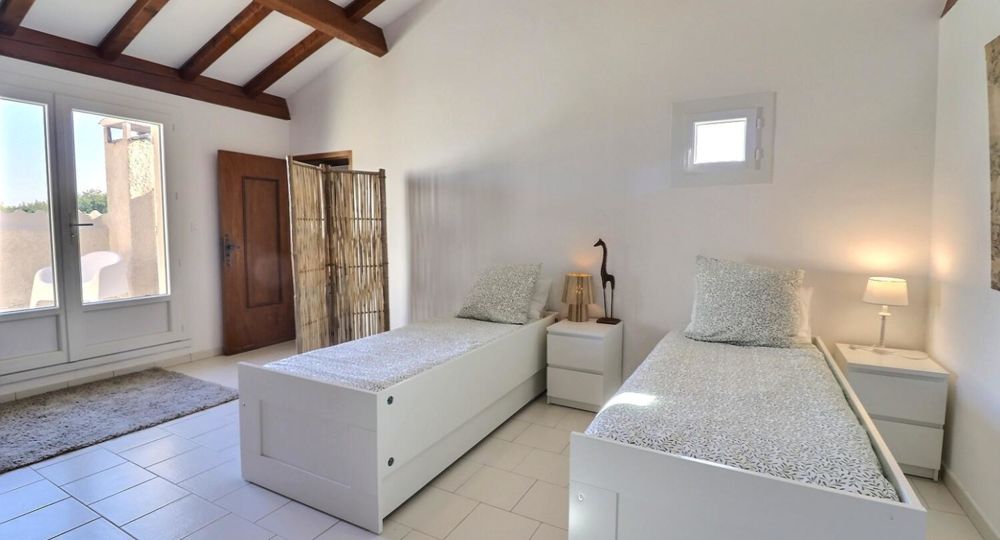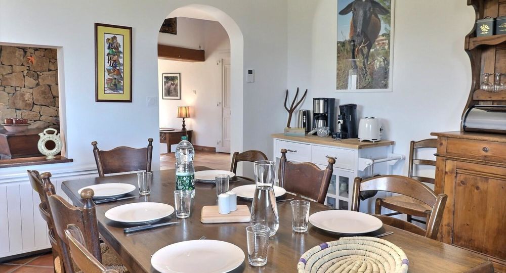 À l’extérieur, jardin, piscine entourée de chaises longues pour vous prélasser au soleil. Coin détente avec fauteuils et tables basses pour profiter du calme ambiant. Espace repas sur les terrasses accessibles depuis la cuisine. Ici, vous pourrez savourer vos repas en plein air, à l’ombre des voiles d’ombrage.