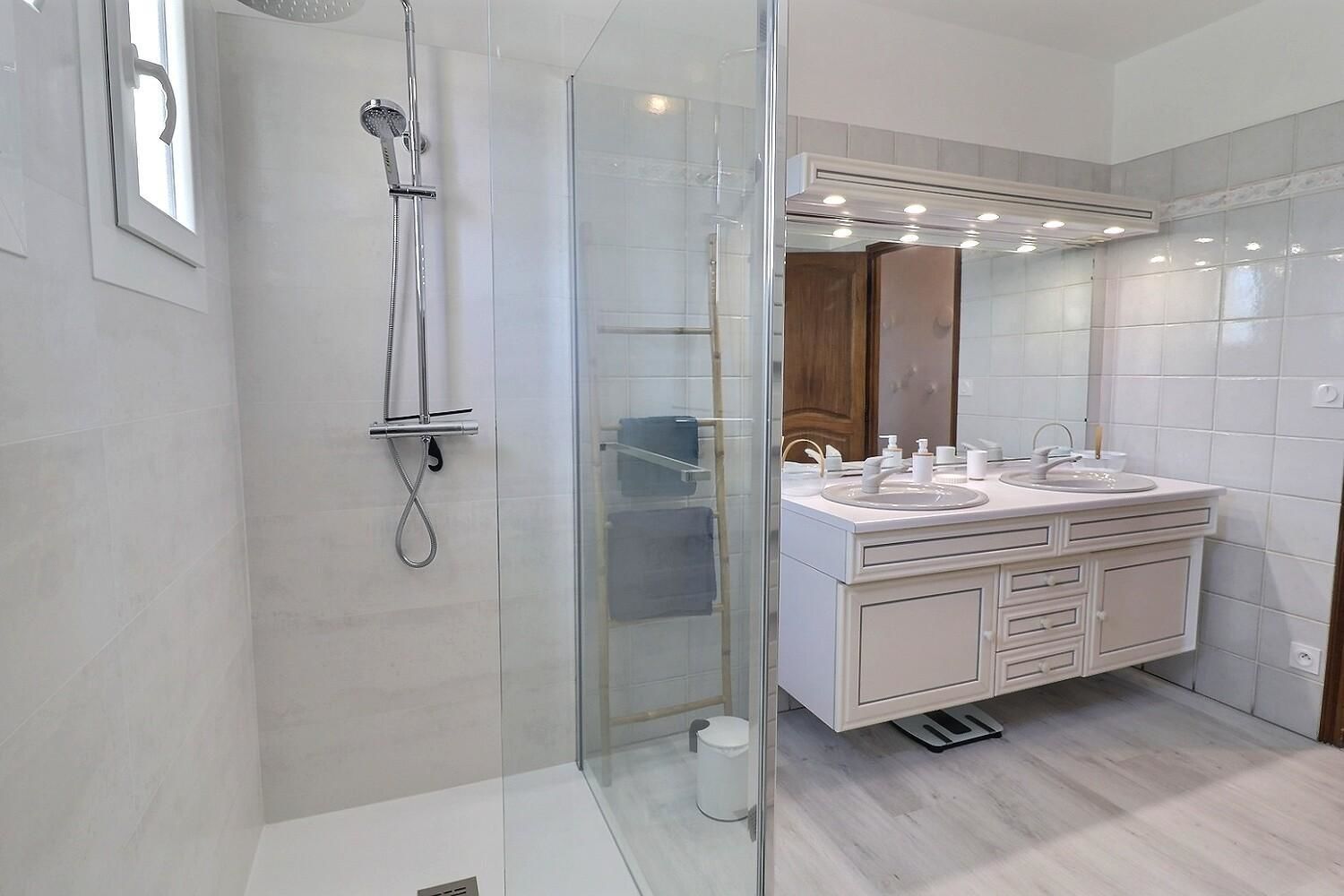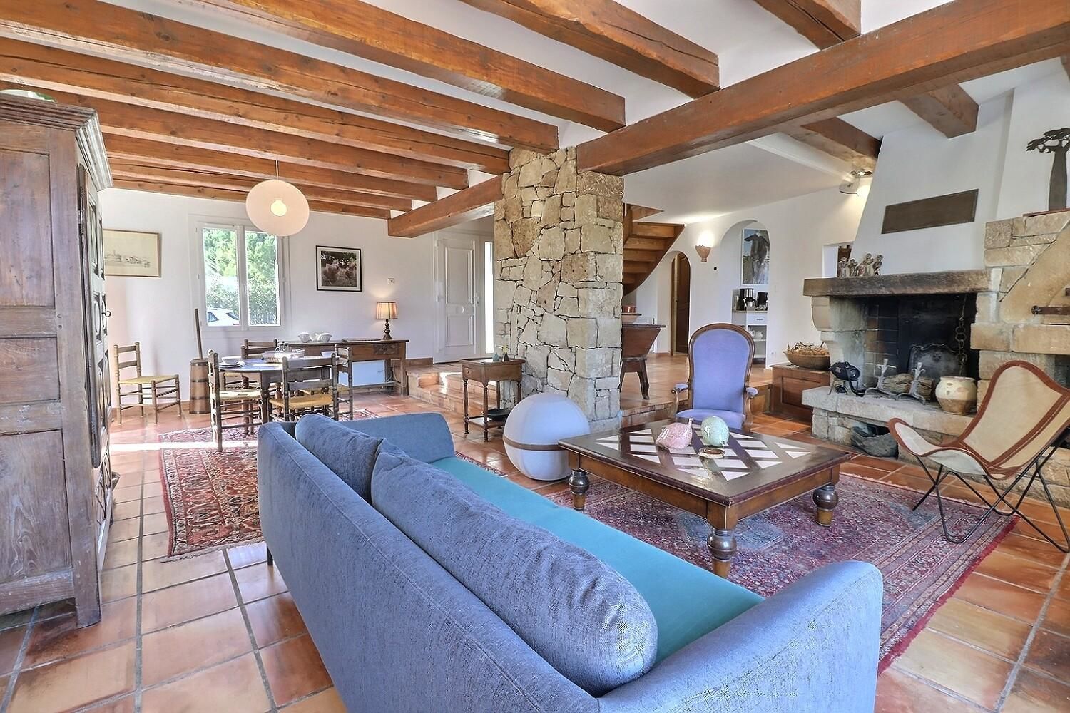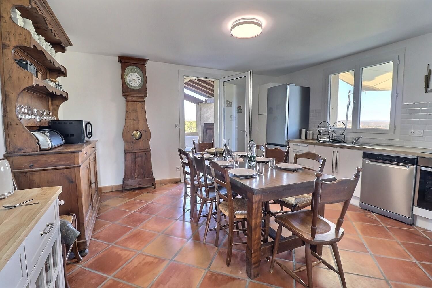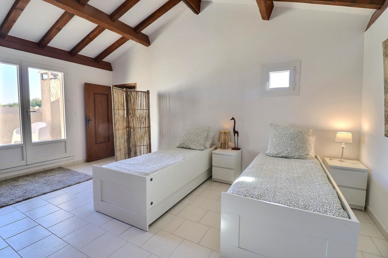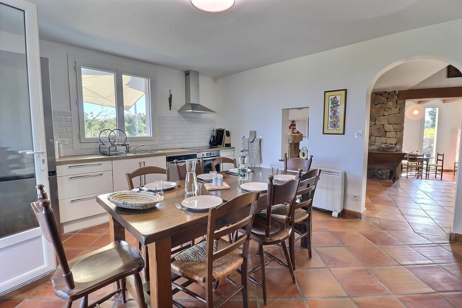 À l’extérieur, jardin, piscine entourée de chaises longues pour vous prélasser au soleil. Coin détente avec fauteuils et tables basses pour profiter du calme ambiant. Espace repas sur les terrasses accessibles depuis la cuisine. Ici, vous pourrez savourer vos repas en plein air, à l’ombre des voiles d’ombrage.