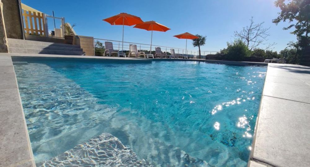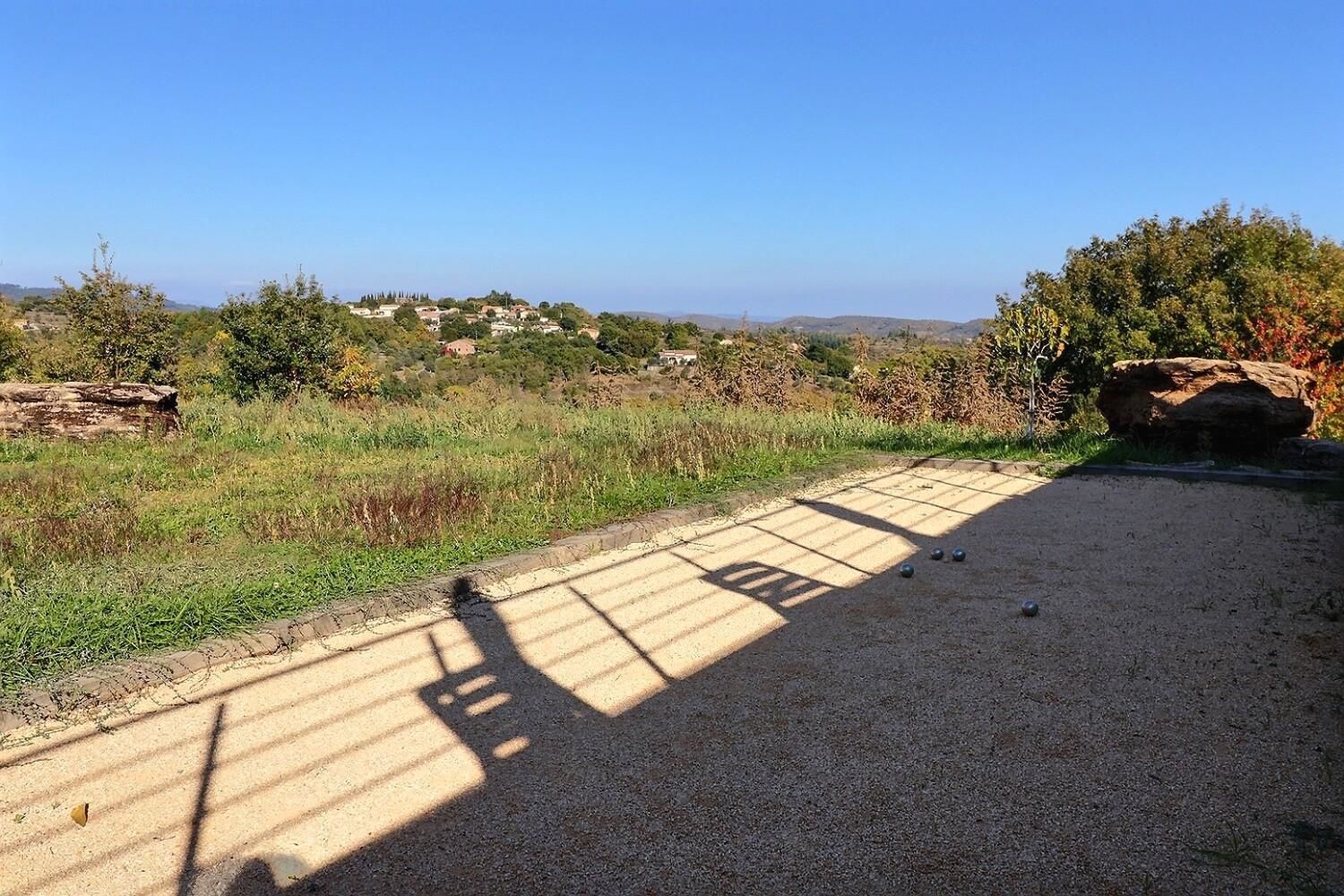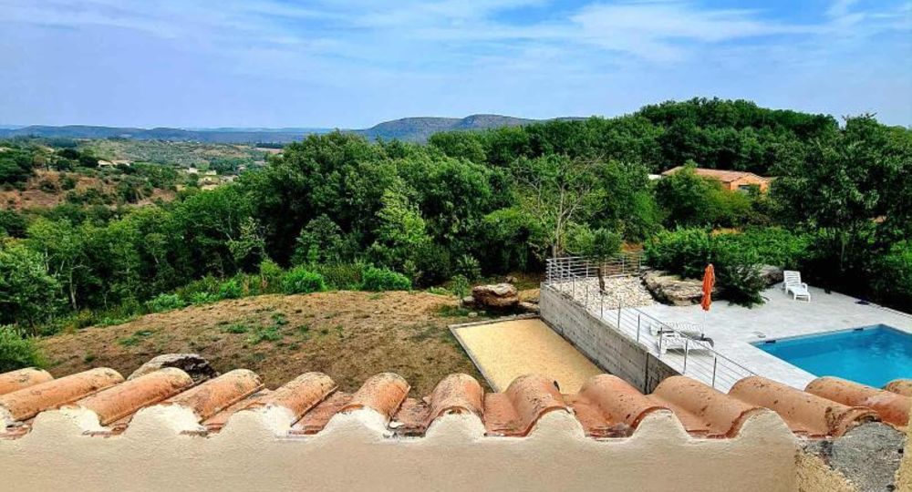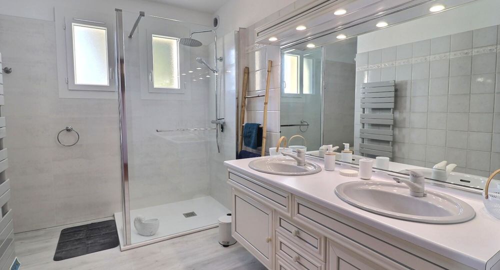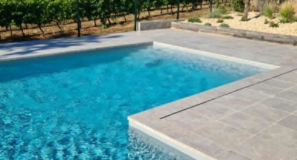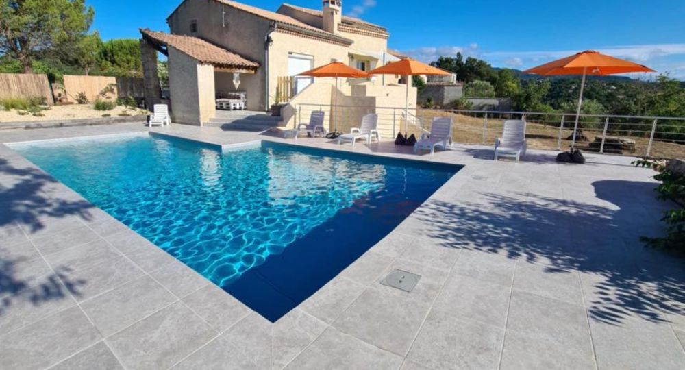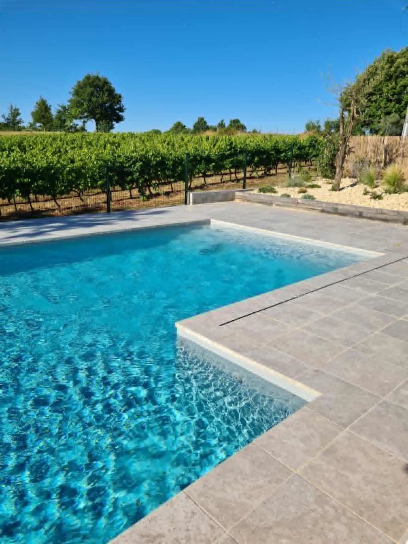 Infos piscine* : piscine en L dim 10,60 mx 5,60 m, prof jusqu’à 2 m – traitement au sel – sécurité portillon, bâche, alarme