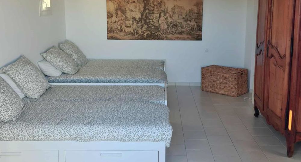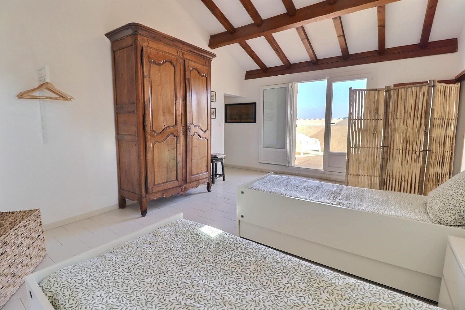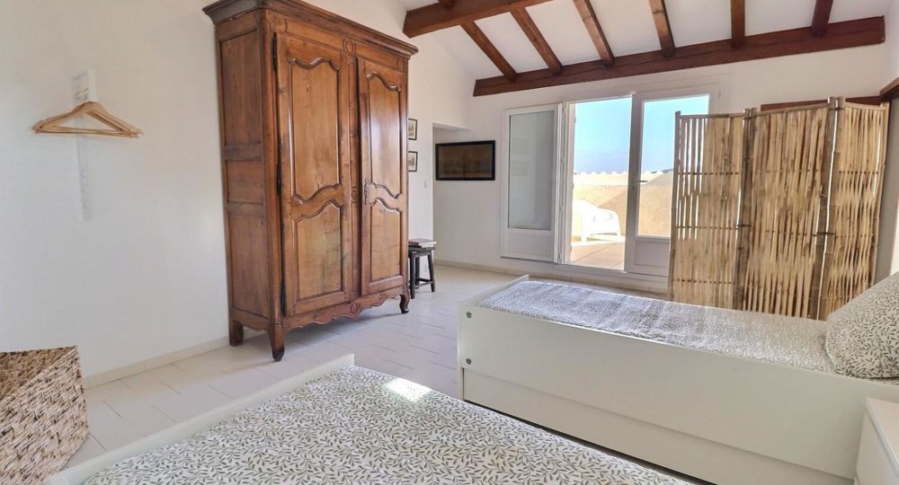À l’étage, une mezzanine accueille un bureau parfaitement adapté au télétravail, 1 chambre parentale (lit en 160) aux couleurs douces et une décoration raffinée, une 2e salle d’eau avec wc. Pour accéder à ces 2 pièces, 1 chambre traversante conçue pour les enfants (2 lits en 80 + 2 lits gigognes offrant 4 couchages). De là, accès sur le toit-terrasse pour profiter pleinement du paysage. Ici, tout est pensé pour allier confort et authenticité (les lits sont faits).