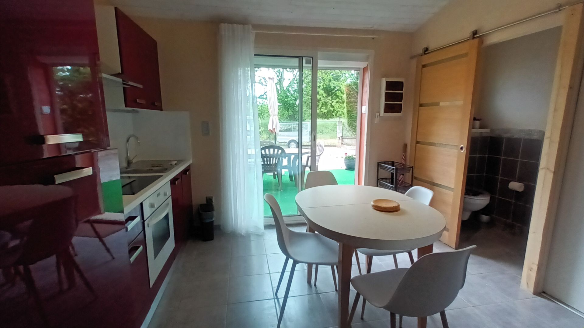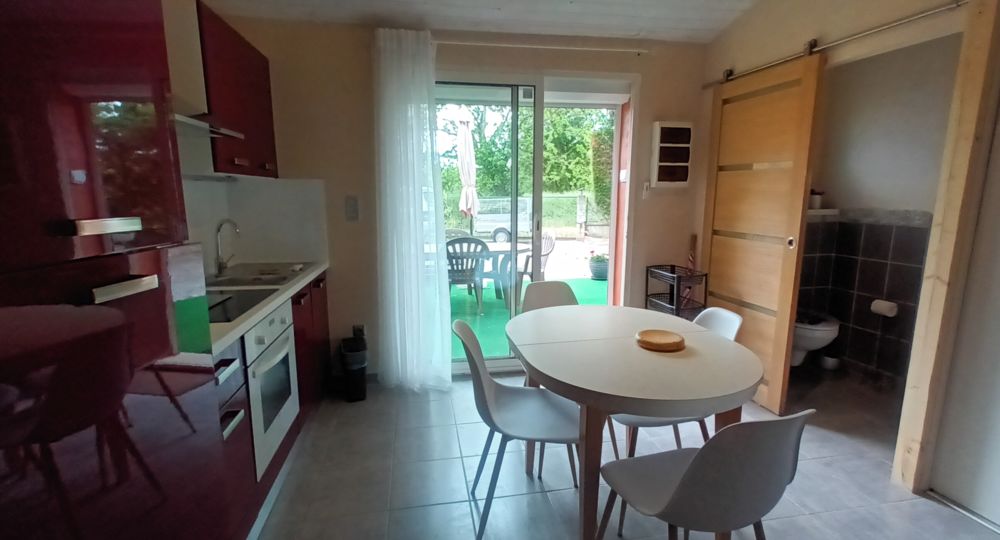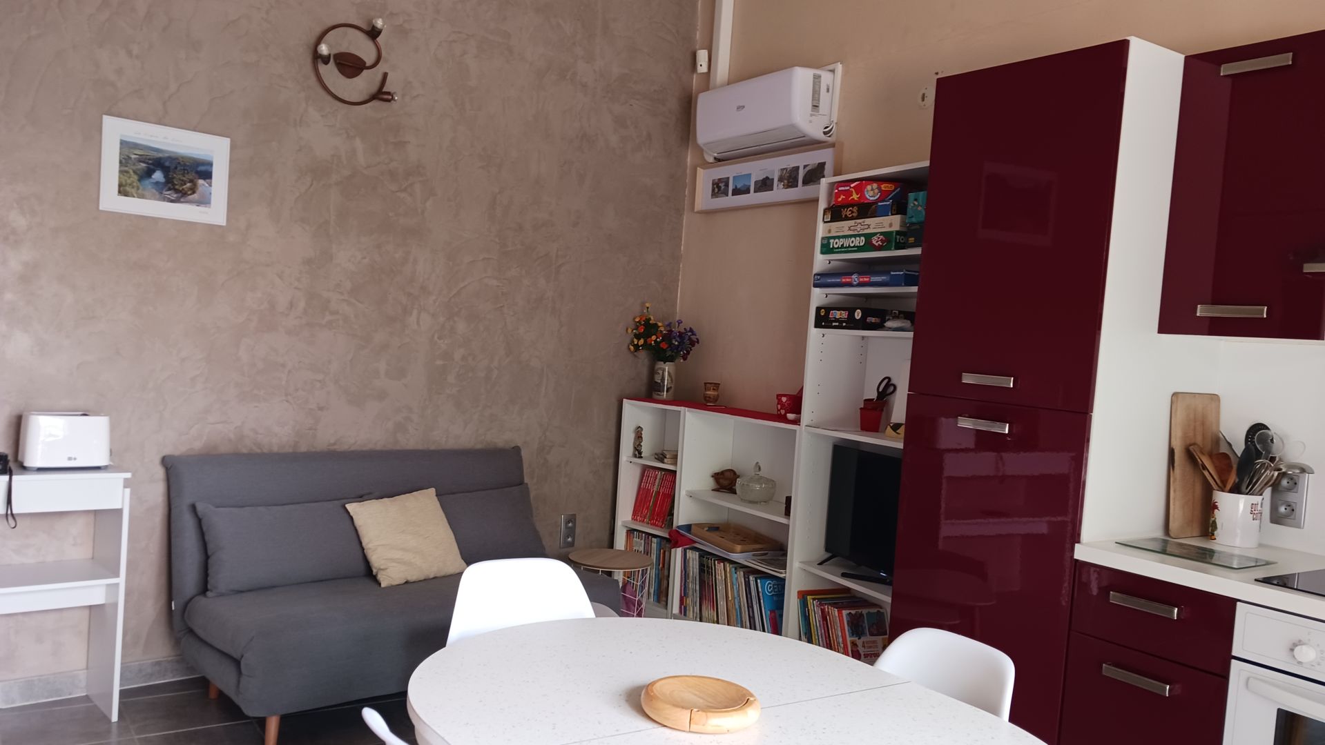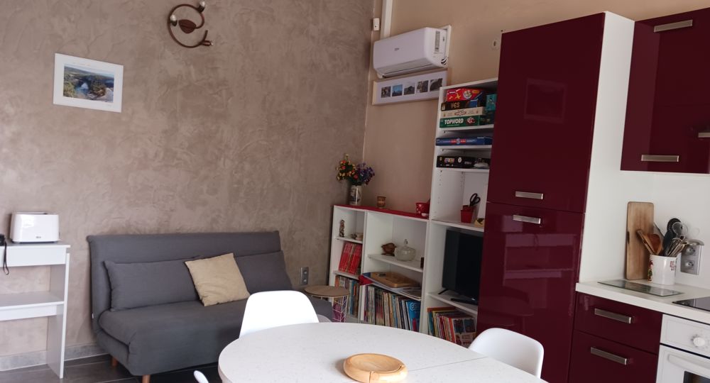 Pièce de vie : lumineuse grâce à sa grande baie vitrée, le logement dispose d’un coin repas et un espace salon : une télévision, avec des jeux de société et des livres. Le canapé convertible offre deux couchages supplémentaires.