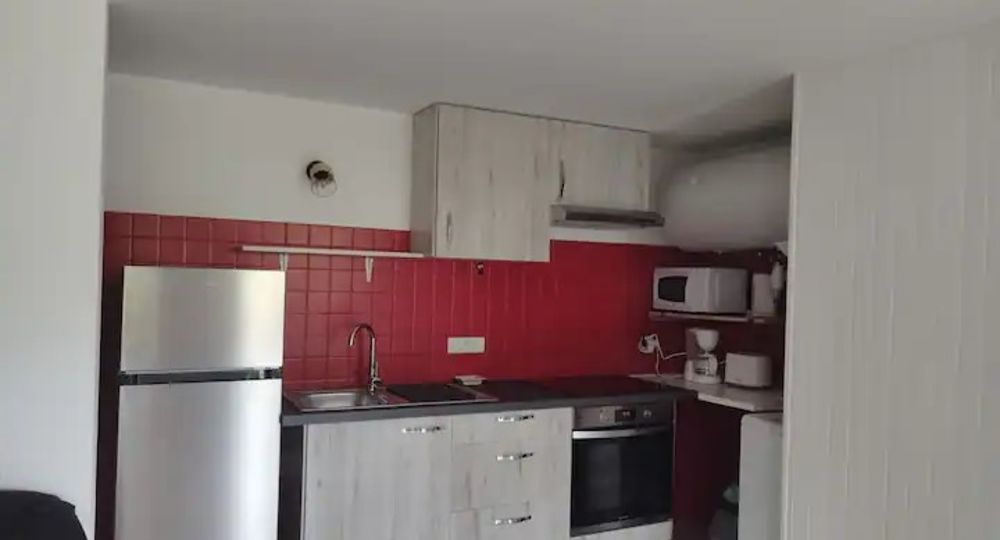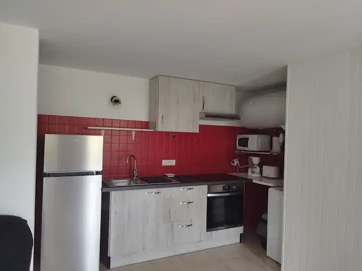 Au rez de chaussée, salle d’eau, coin cuisine, salle à manger/salon. Petite terrasse et une place de parking privative. Boite à clés sur place.
