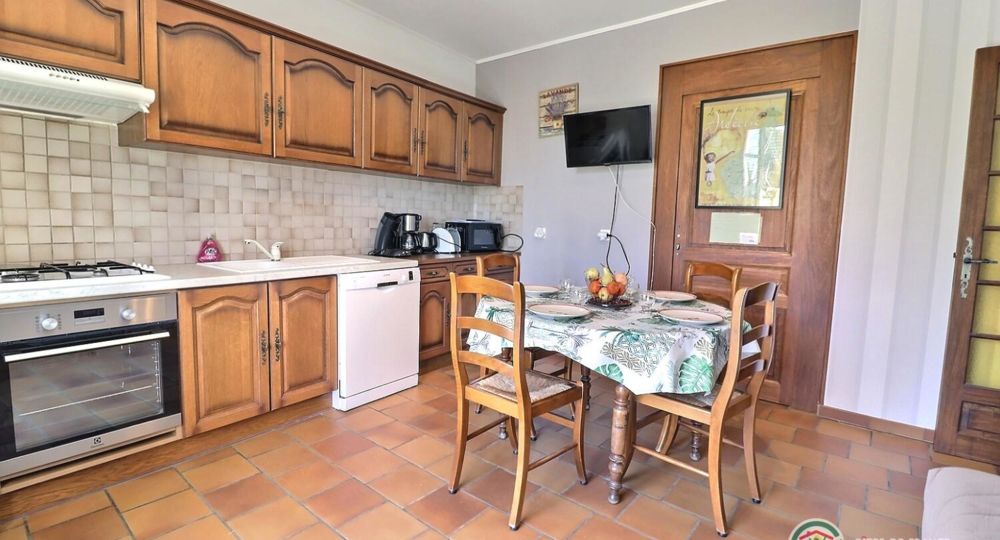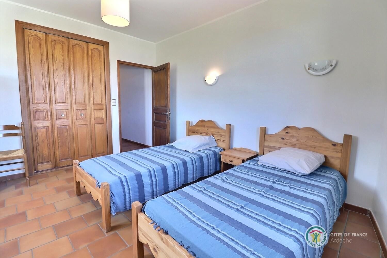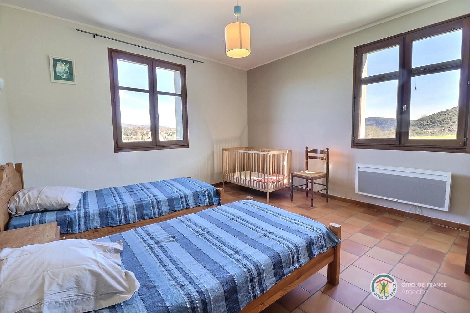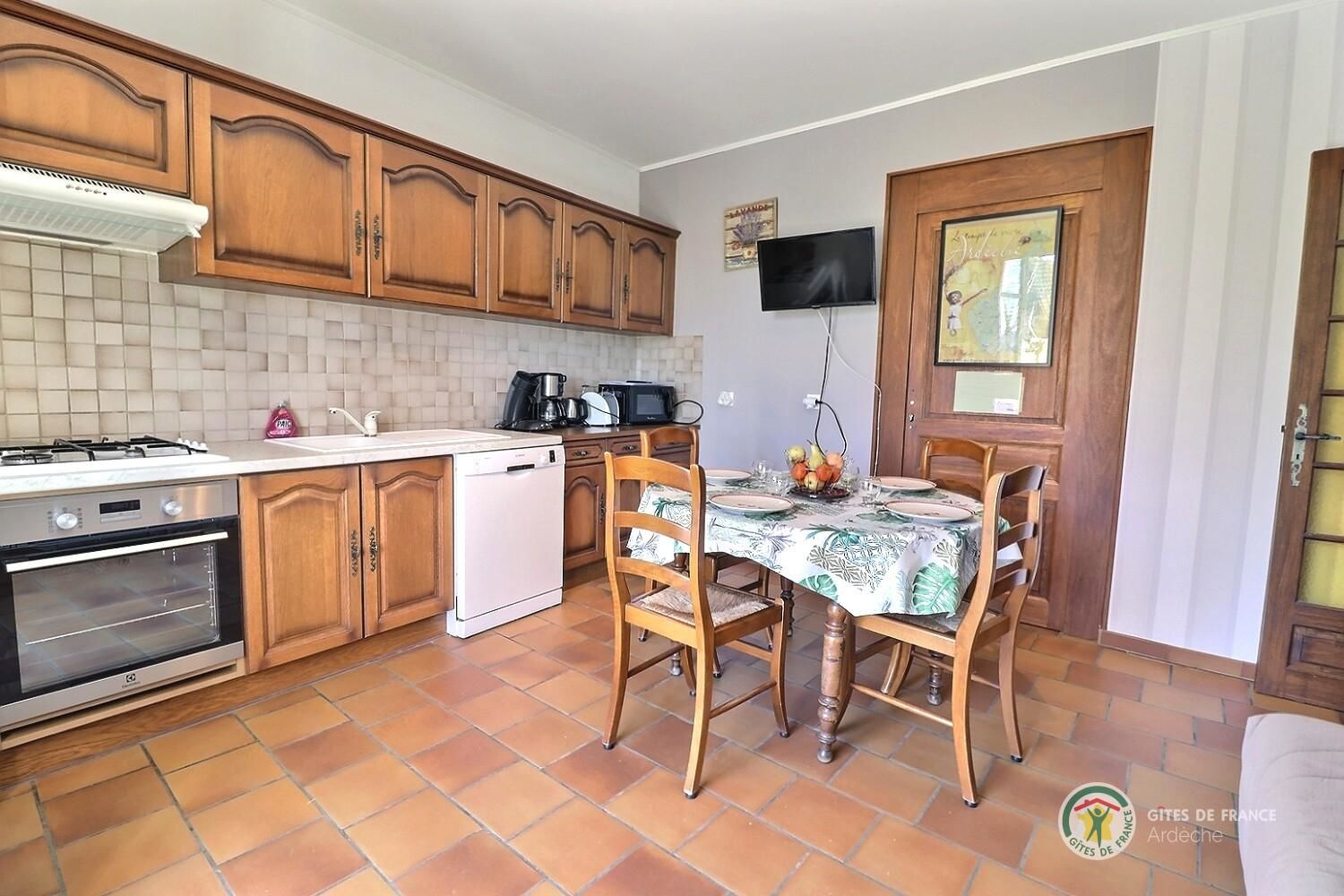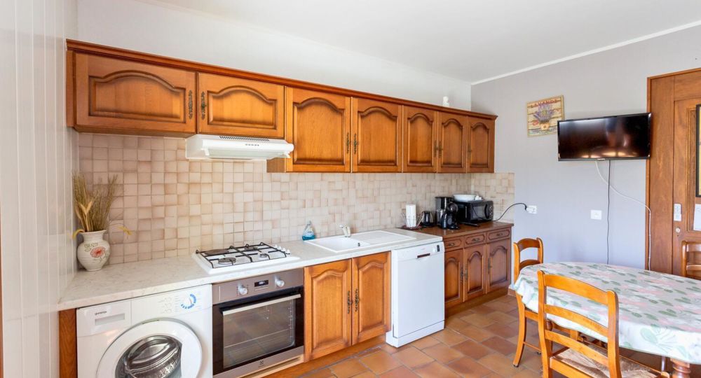 Accès au gîte indépendant. Séjour, coin cuisine intégré bien équipé, canapé, ch1 (1 lit 2 pers), ch2 (2 lits 1 pers, 1 lit bébé). Salle d’eau, wc. Terrasse close. Chauffage électrique.