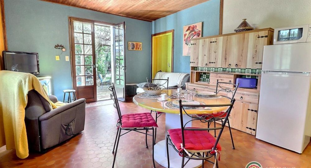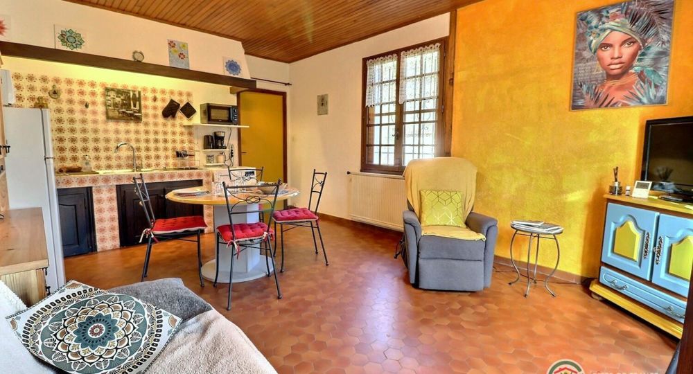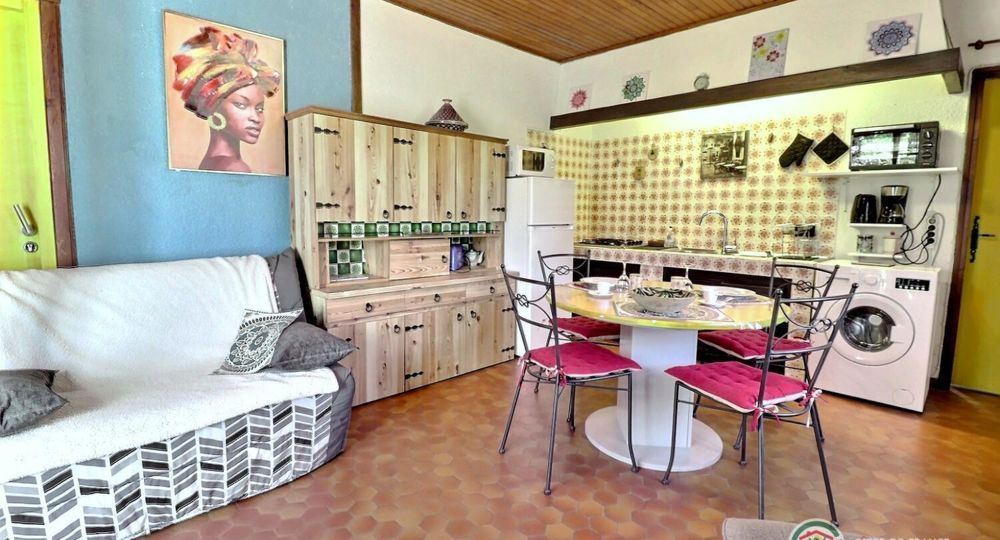 Dans cette pièce, salon avec canapé, fauteuil électrique relax, TV, coin repas et cuisine équitablement équipée.
