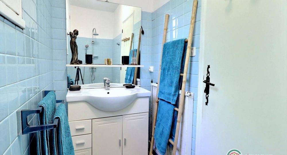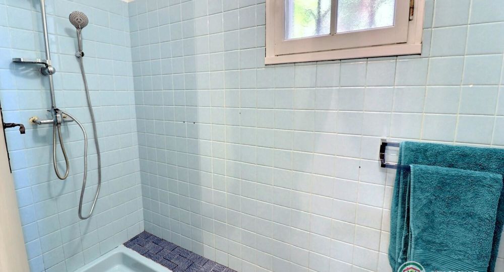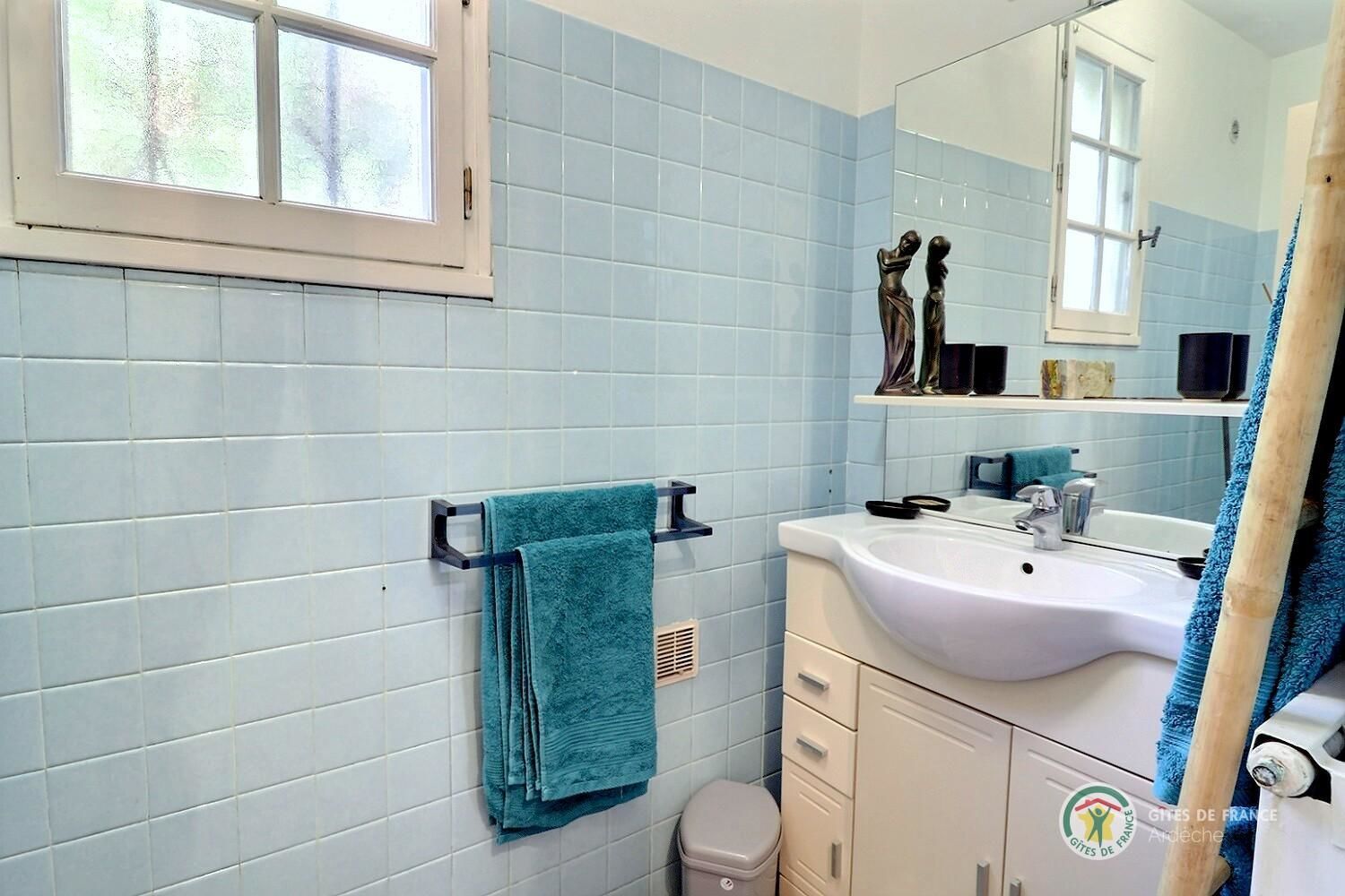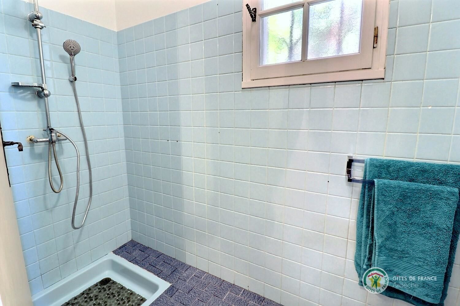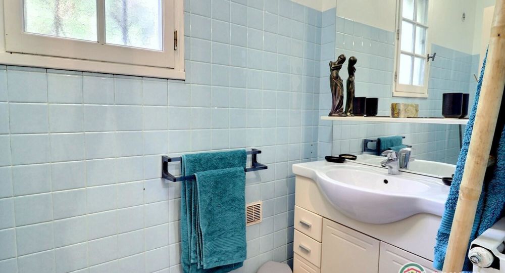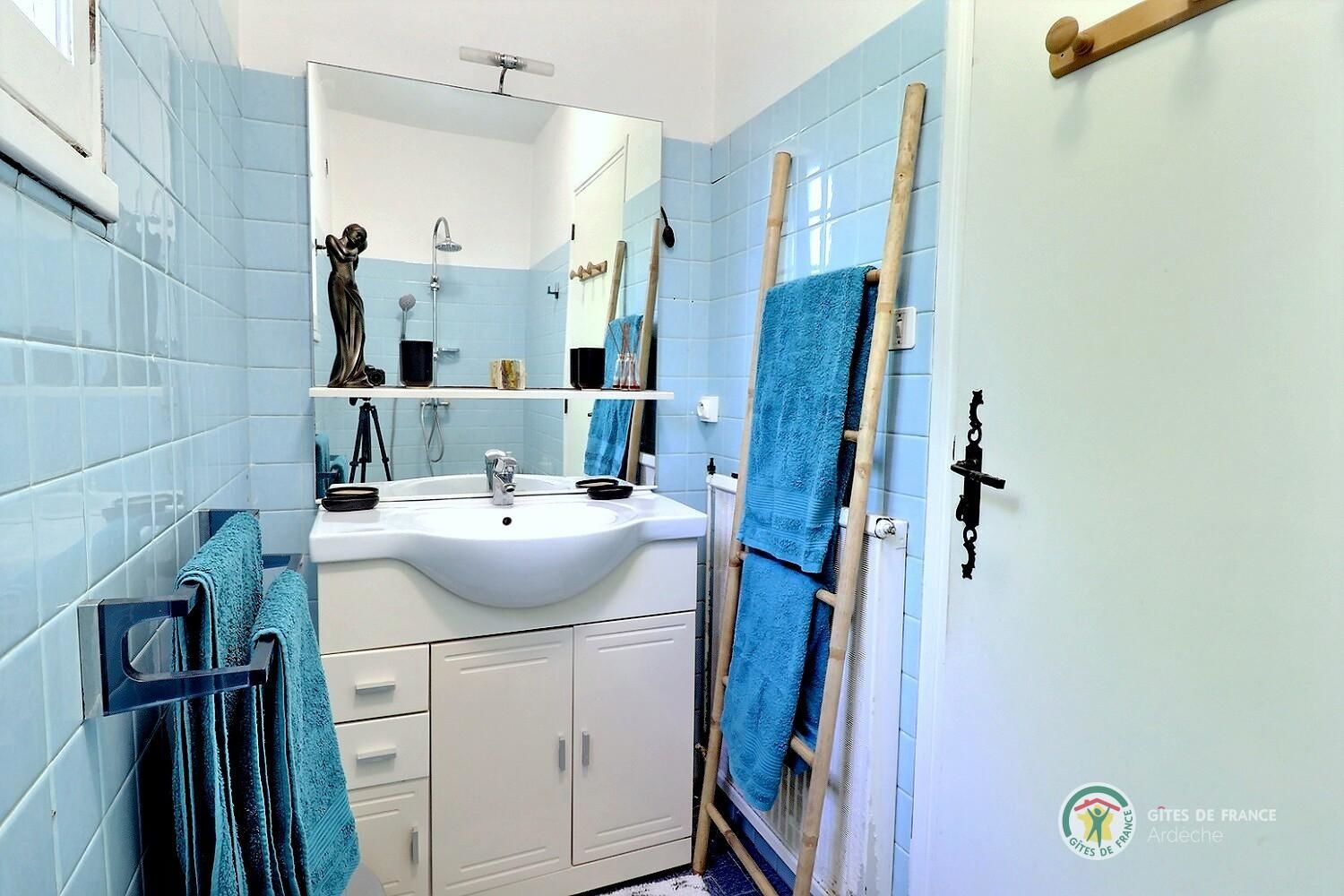 La salle d’eau, « ancienne génération », est petite mais tout y est : meuble vasque, sèche-cheveux et bac de douche.