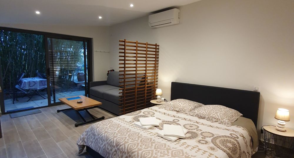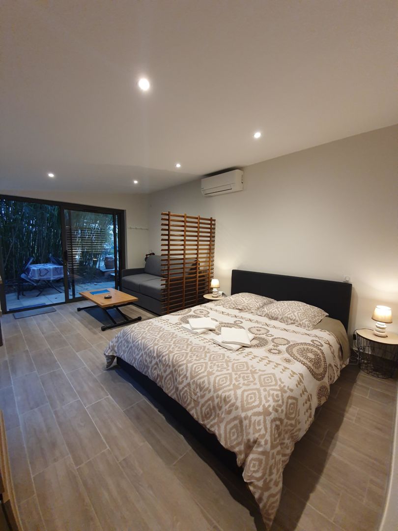 Votre espace privé • Surface : 24 m² bien agencés. • Aménagement : pièce principale accueillant un coin nuit, un coin jour convivial avec canapé hôtelier, et une kitchenette équipée. Salle d’eau privative. • Extérieur privatif : profitez d’une terrasse privée avec salon de jardin, nichée au cœur de la bambouseraie, offrant fraîcheur et intimité. Un accès arrière avec transats est également disponible. • Localisation : entrée principale située à proximité immédiate de la piscine. • Équipements du gîte • Couchage : 1 lit double queen size (160 x 200) et un canapé hôtelier convertible (140 x 190) pouvant accueillir jusqu’à deux personnes supplémentaires (supplément applicable). • Climatisation réversible et TV. • Kitchenette : micro-ondes grill, plaque à induction, cafetière à dosettes souples et frigo top.