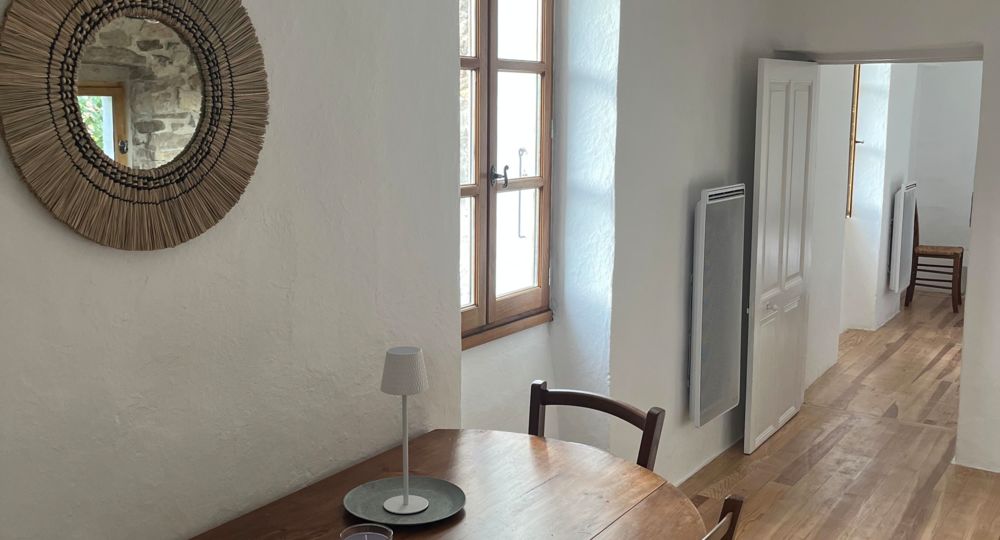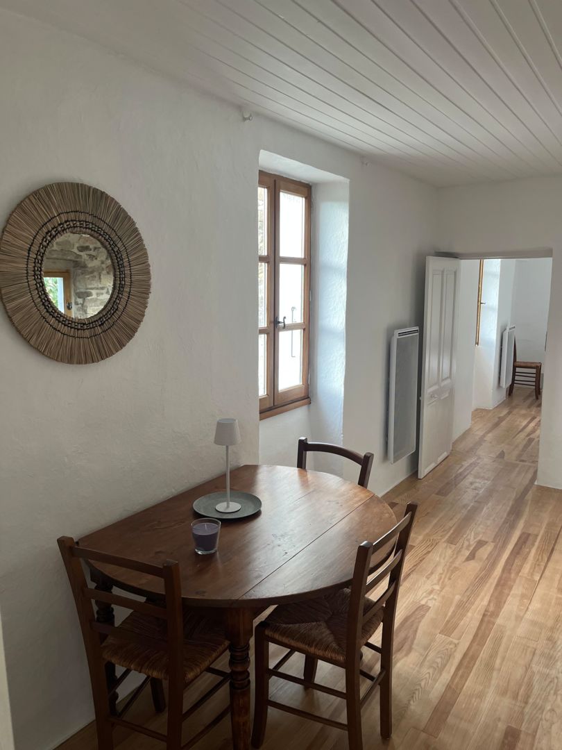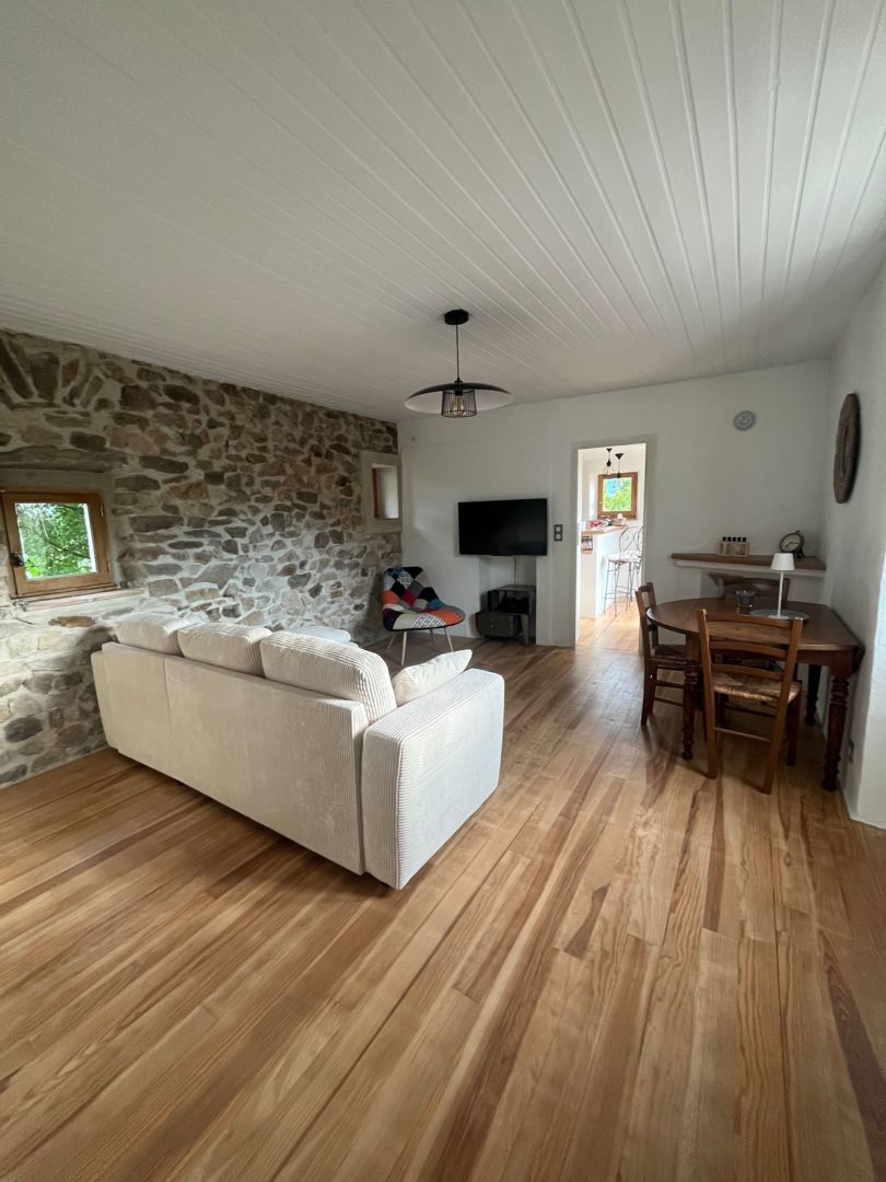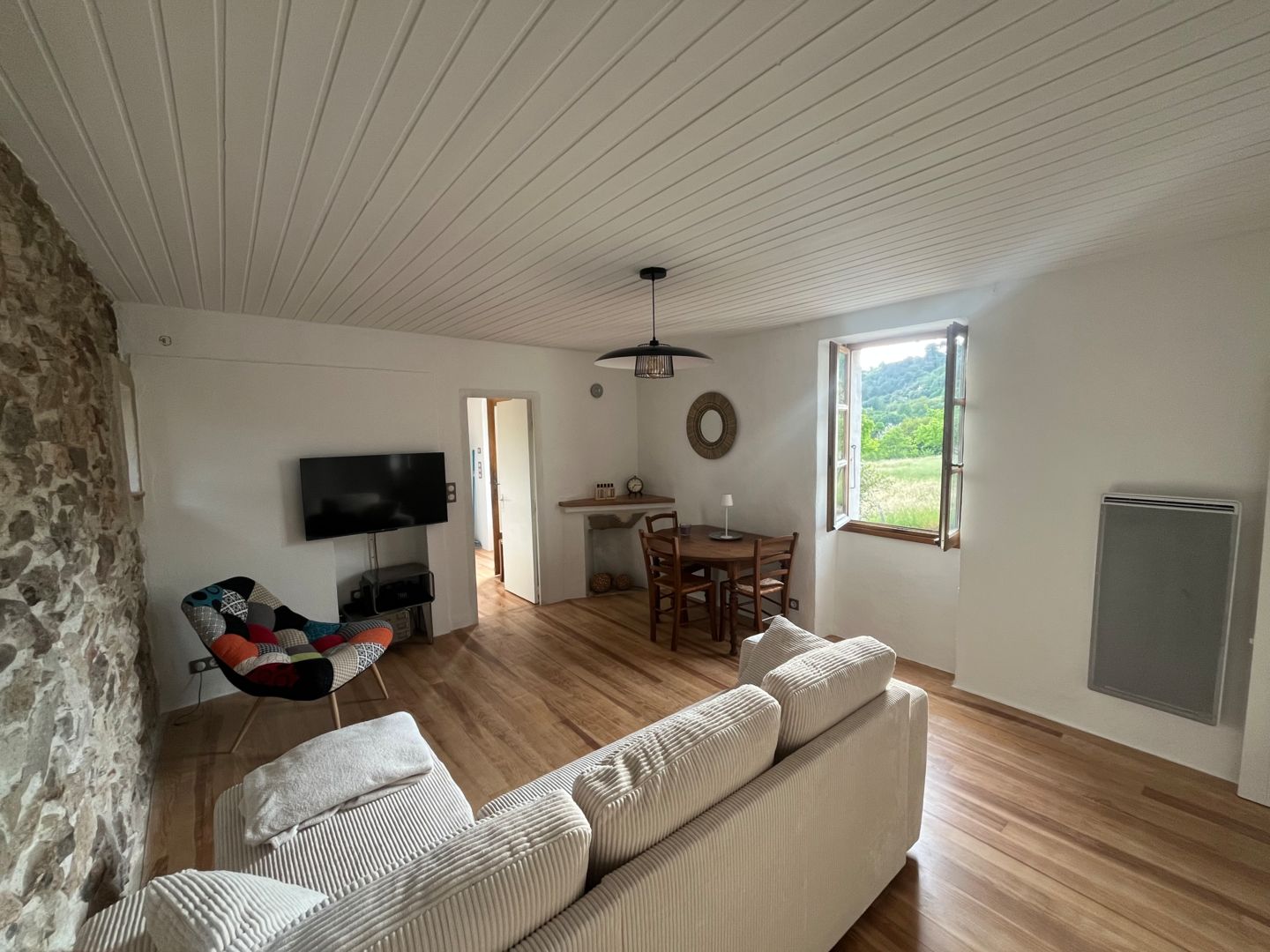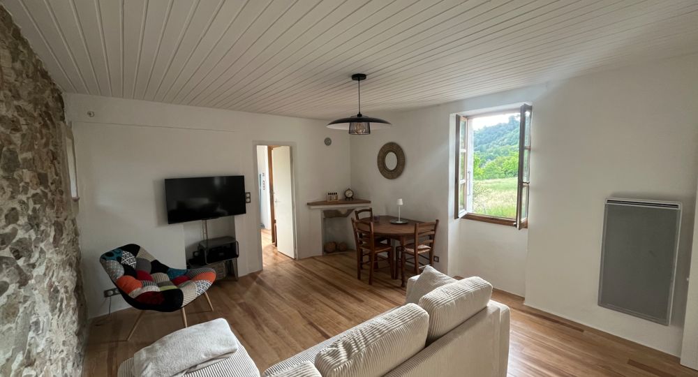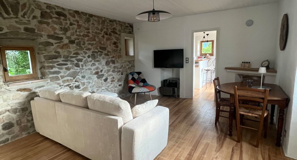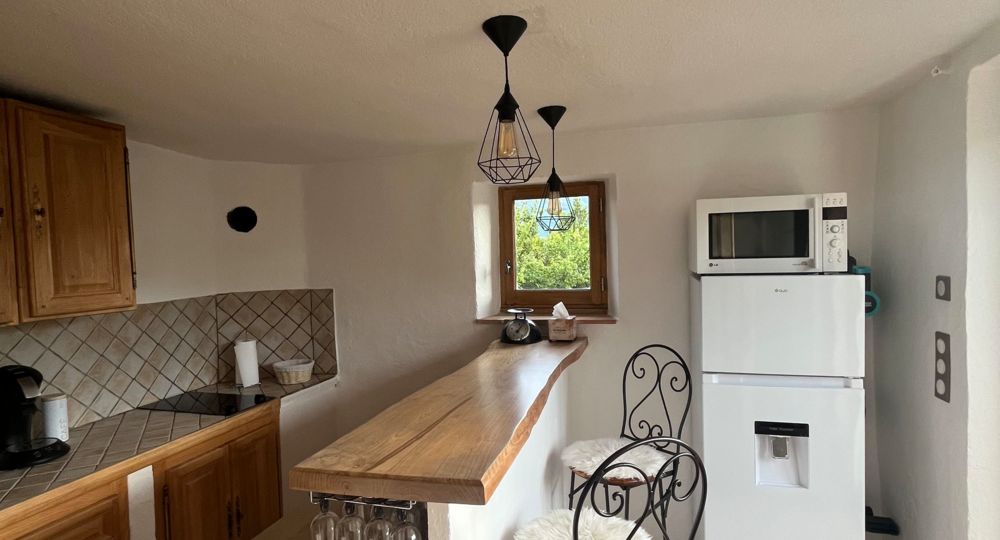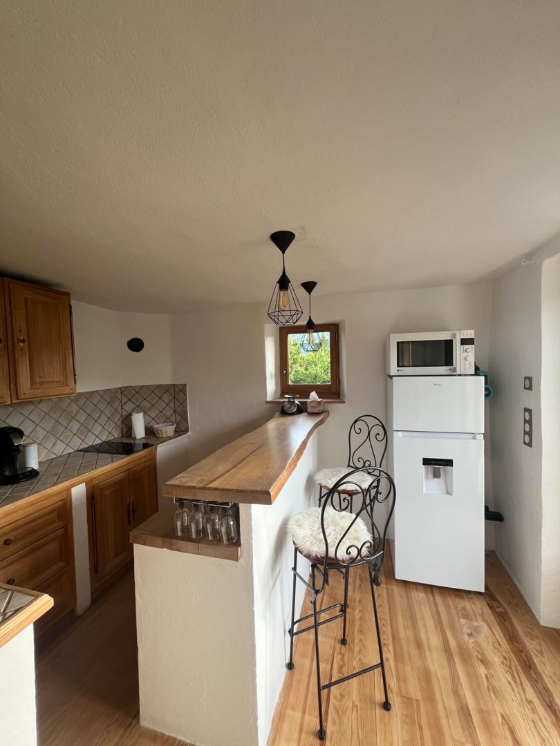 Logement entièrement rénové intérieurement (peintures, sol et changement des meubles). Possède une pompe à chaleur/clim neuve. Le chemin d’accès vient d’être refait et est accessible très facilement en voiture. Literie de la chambre neuve en 160x200cm, matelas Bultex de qualité Douche à l’italienne avec colonne et pommeau neufs. WC séparé de la salle de bains Salon avec un mur pierres apparentes très chaleureux comprenant un canapé trois places. Table à manger 4 places. Télévision écran plat connectée Internet fibre inclus Cuisine équipée avec four, plaques induction, micro-ondes et lave-vaisselle. Petit balcon avec plateau et tabourets type mange debout pour déjeuner face au paysage. Machine à laver disponible dans la cave. Terrasse extérieure sous un arbre avec table et barbecue.