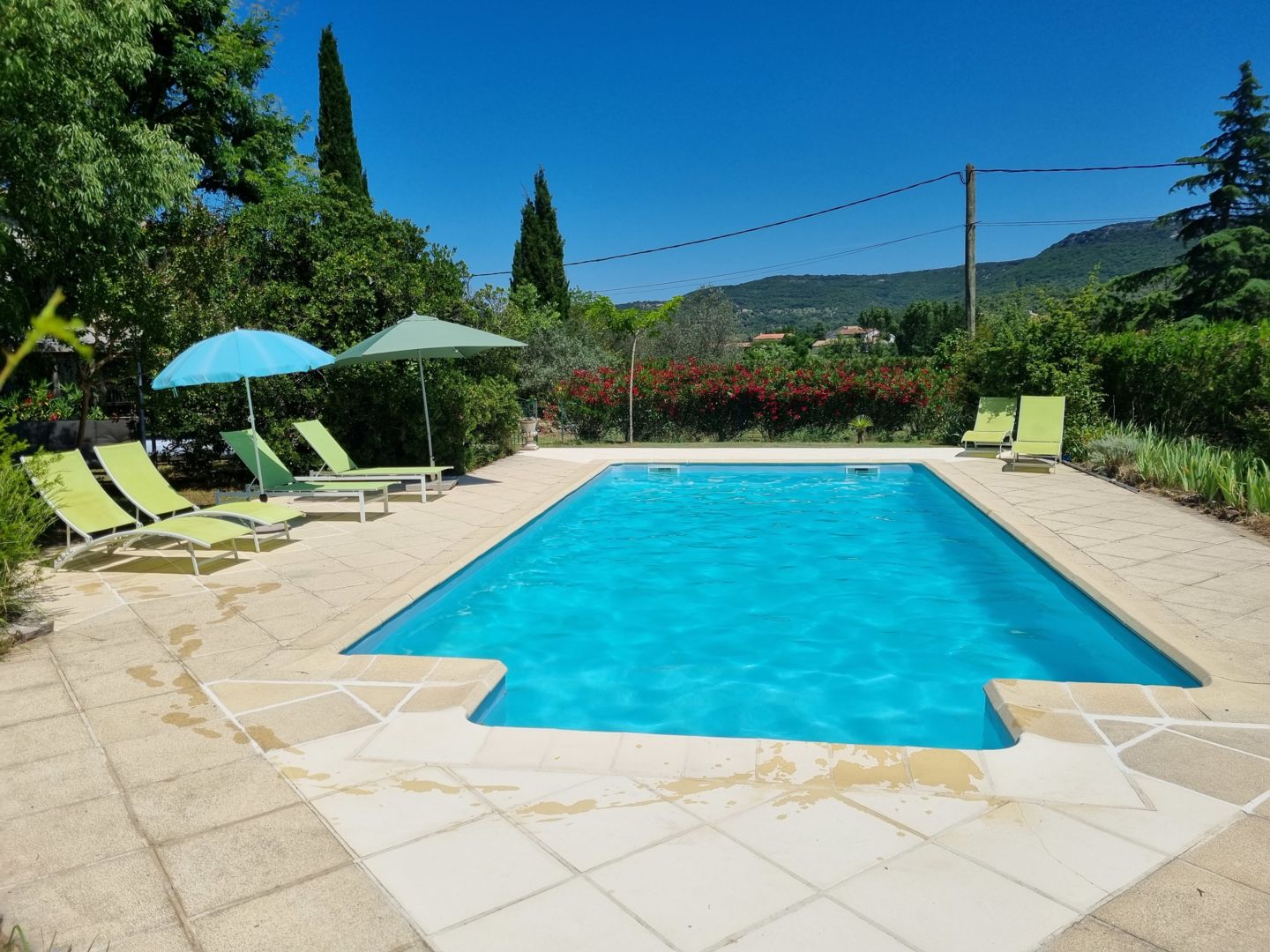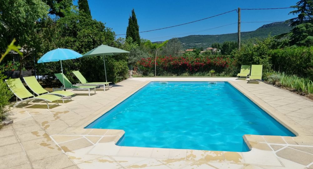 – terrasse privée dans un grand jardin avec une piscine partagée 10X5 et un barbecue gaz .