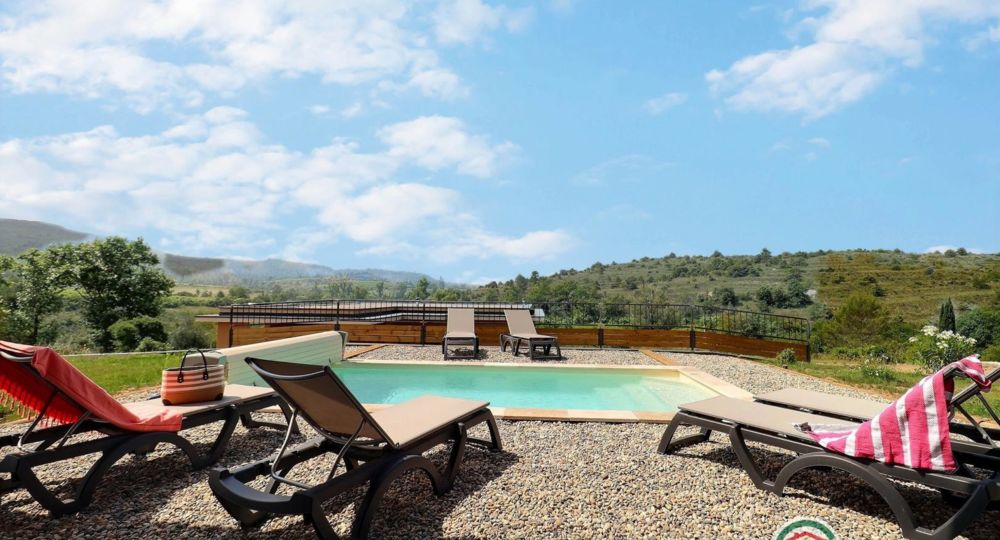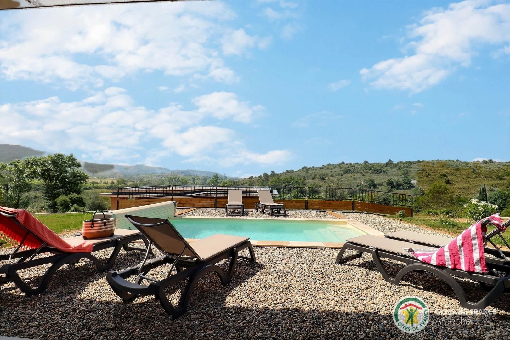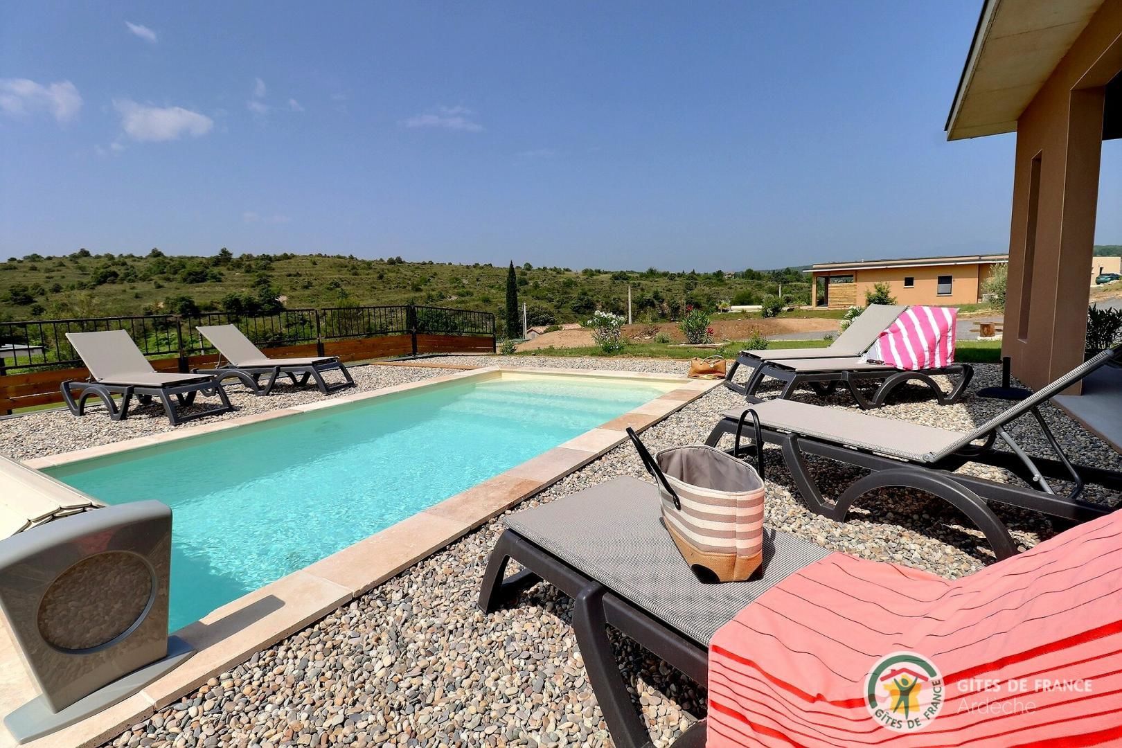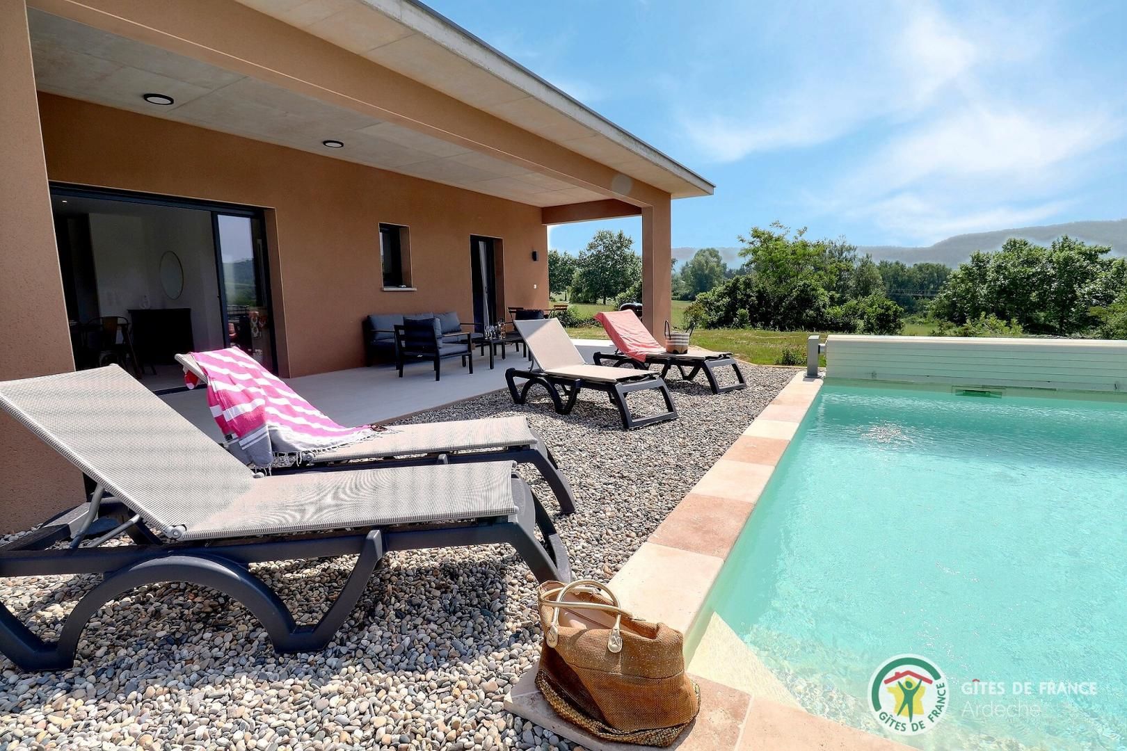 La belle piscine privative, sécurisée, vous attend pour des journées farniente sous le soleil ardéchois.