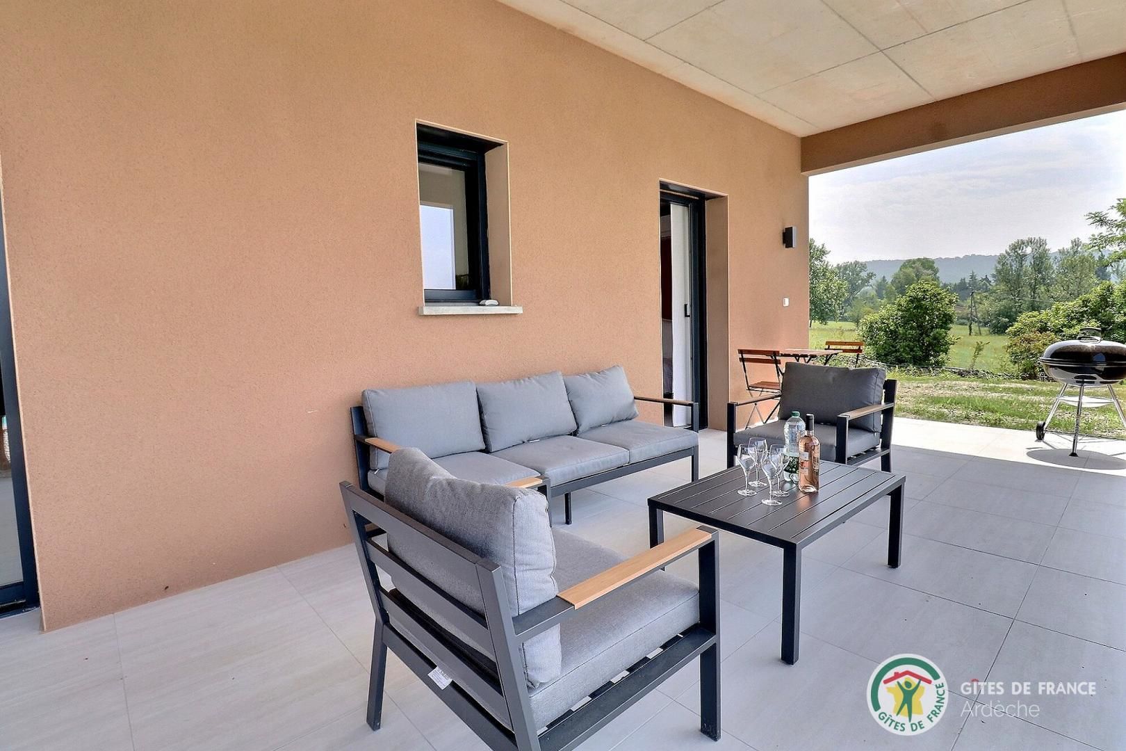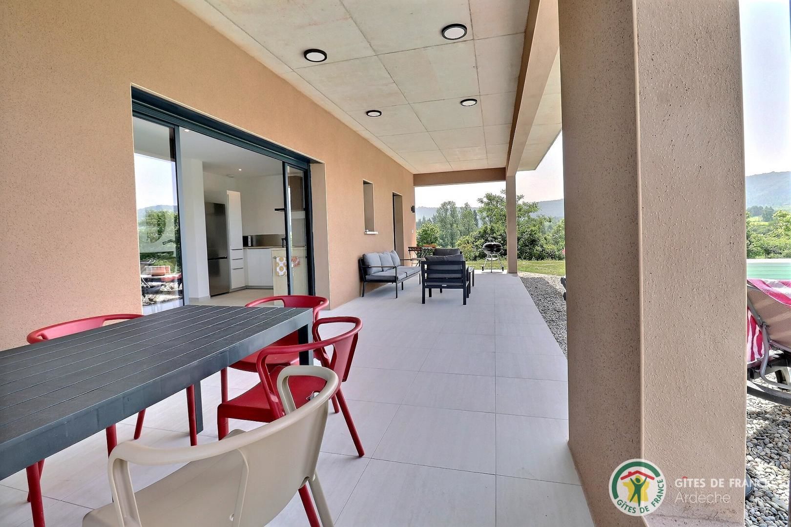 Pour les repas et les longues soirées d’été, la vaste terrasse couverte devient le cœur de la maison avec un salon de détente, barbecue, et un espace repas.