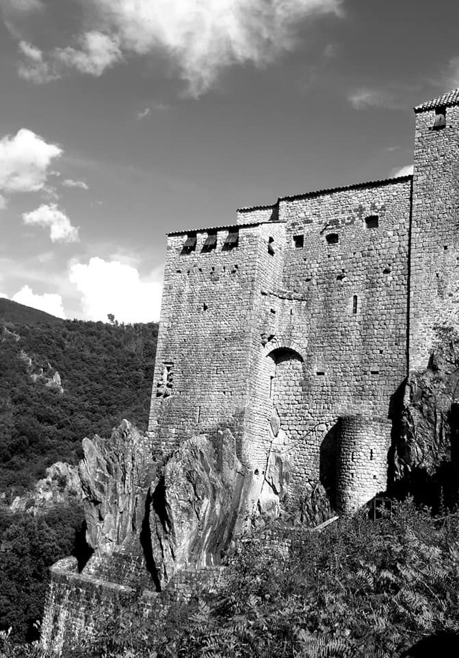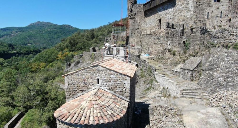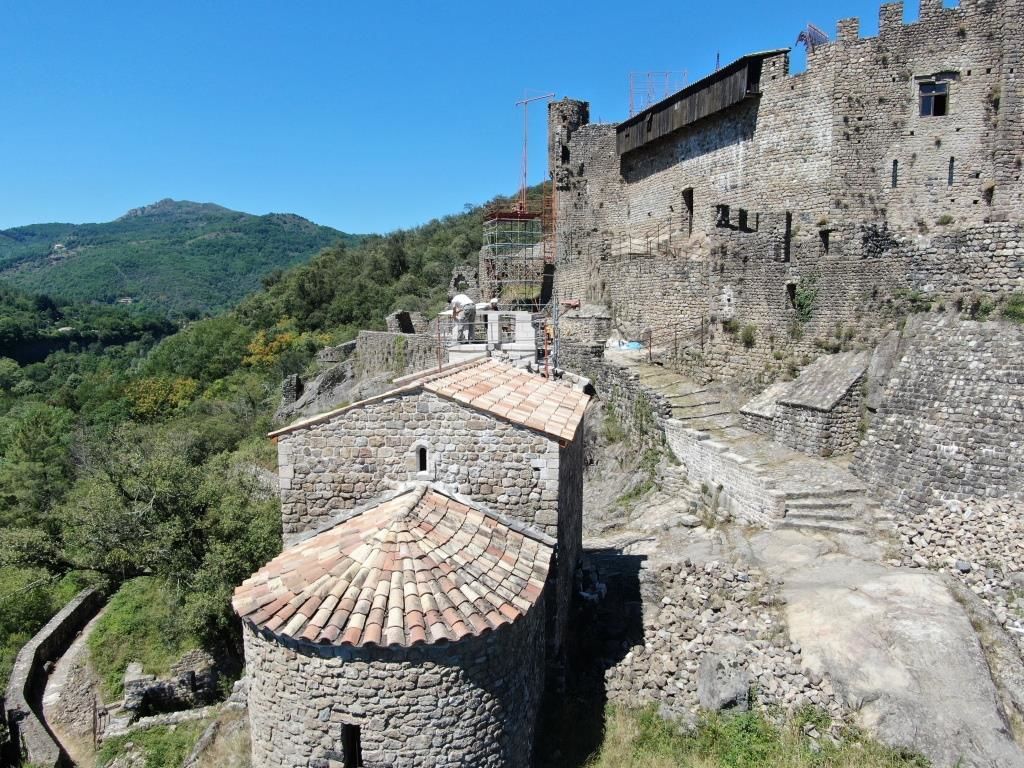 Ventadour est un château fort formé d’une juxtaposition de constructions de différentes époques, allant du 12ème au… 21ème siècle. Cette longue évolution, entrecoupée de périodes de destructions ou d’abandon, donne une architecture unique. Cet impressionnant monument aux constructions d’ampleur, s’appuyant sur un socle granitique, est un des plus grands châteaux médiévaux du département de l’Ardèche. Le site culmine à 373 mètres d’altitude sur un éperon rocheux pointant en direction de la confluence de l’Ardèche et de la Fontaulière qu’il surplombe de 80 mètres. Si les faces nord, est et sud du site sont constituées de parois et de pentes abruptes, à l’ouest, il est rattaché au massif montagneux qui le domine. Ce socle est constitué par un granit dit du Tanargue, qui diffère des roches environnantes. L’aspect actuel du château est en grande partie dû à un projet fou de reconstruction mené par Pierre Pottier et son épouse Françoise entre 1969 et 2018. Suite à son décès, le projet de reconstruction totale qu’il envisageait a pris fin. Néanmoins, l’association de Sauvegarde du château de Ventadour, fondée en 1969, a pris le relai depuis 2018 et gère l’ouverture du monument au public, le chantier de bénévoles qui a lieu chaque été et se charge également de l’entretien du site.